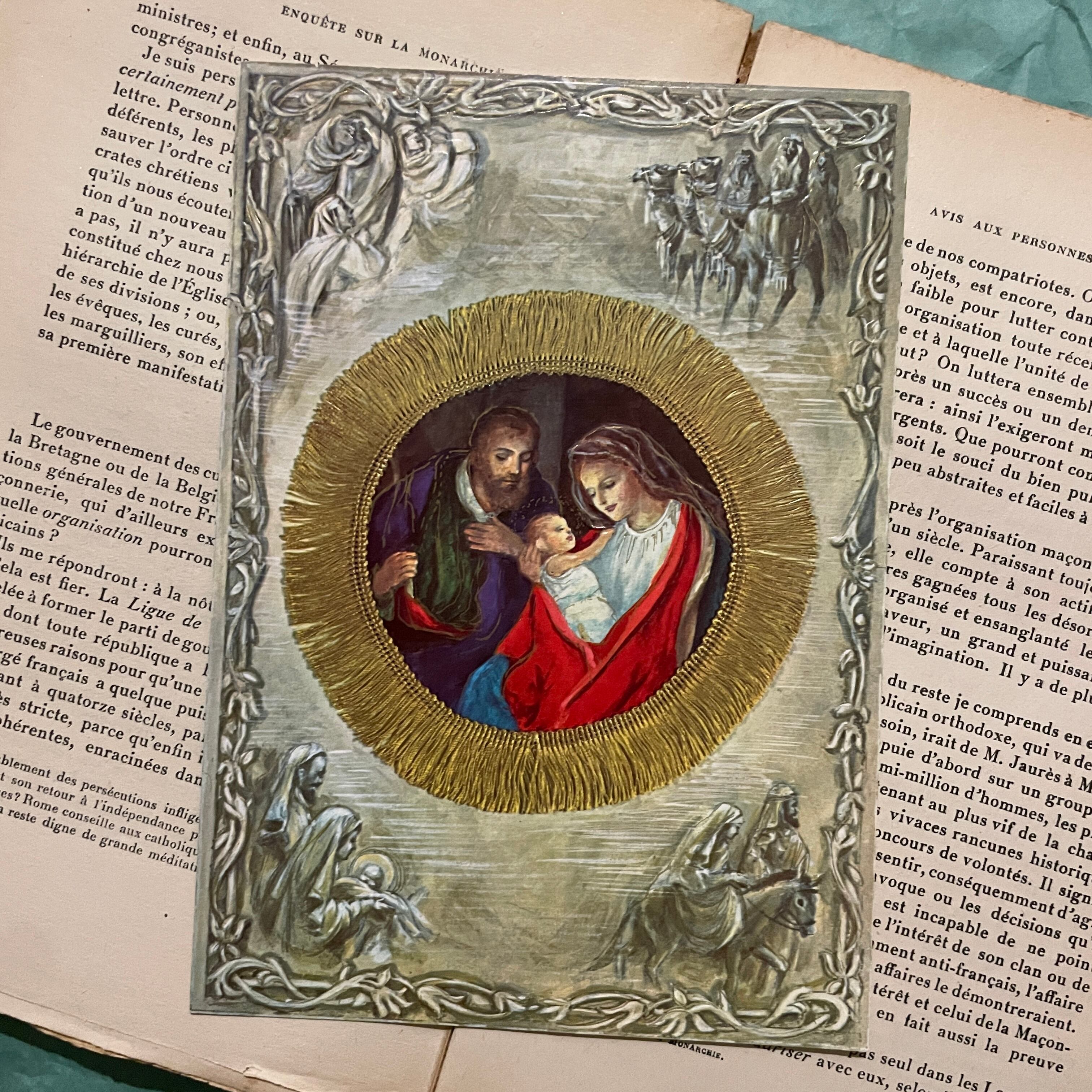 こちらは聖母マリアと幼子イエスを描いた美しいクリスマスカードです。温かみのある柔らかな色彩と繊細なタッチで表現された聖母子の姿は、クリスマスの神聖さと家族の愛を感じさせてくれます。宗教的なテーマが中心でありながら、普遍的な優しさと平和のメッセージが込められています。特に金箔や装飾的なデザインがさらに上品さを際立たせ、特別感を演出しています。