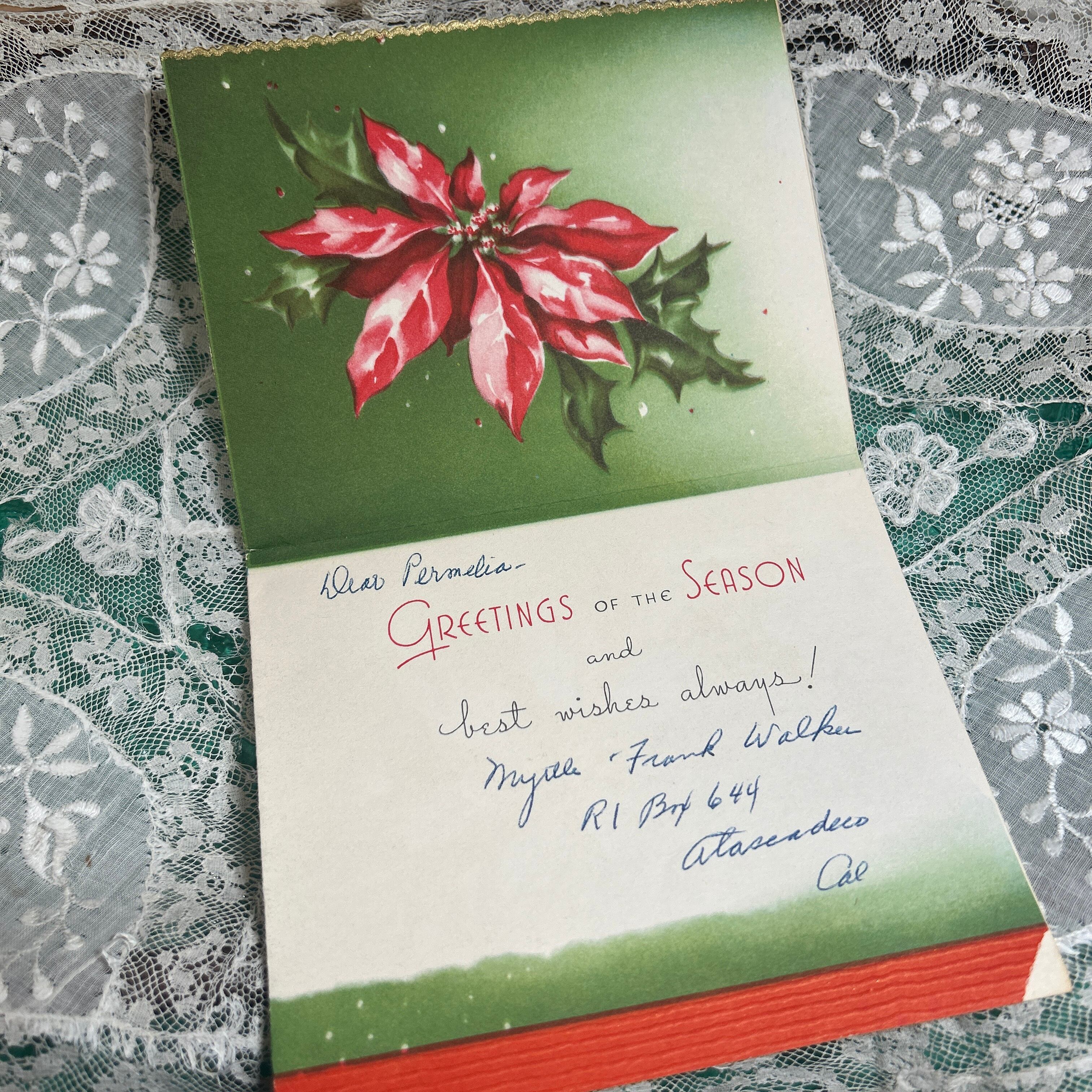 カードのデザインは、手作業で彩色されたようなヴィンテージの風合いが魅力的で、上質な紙に印刷されています。特にポインセチアの赤と緑のコントラストが、クリスマスシーズンの暖かさと華やかさを感じさせます。