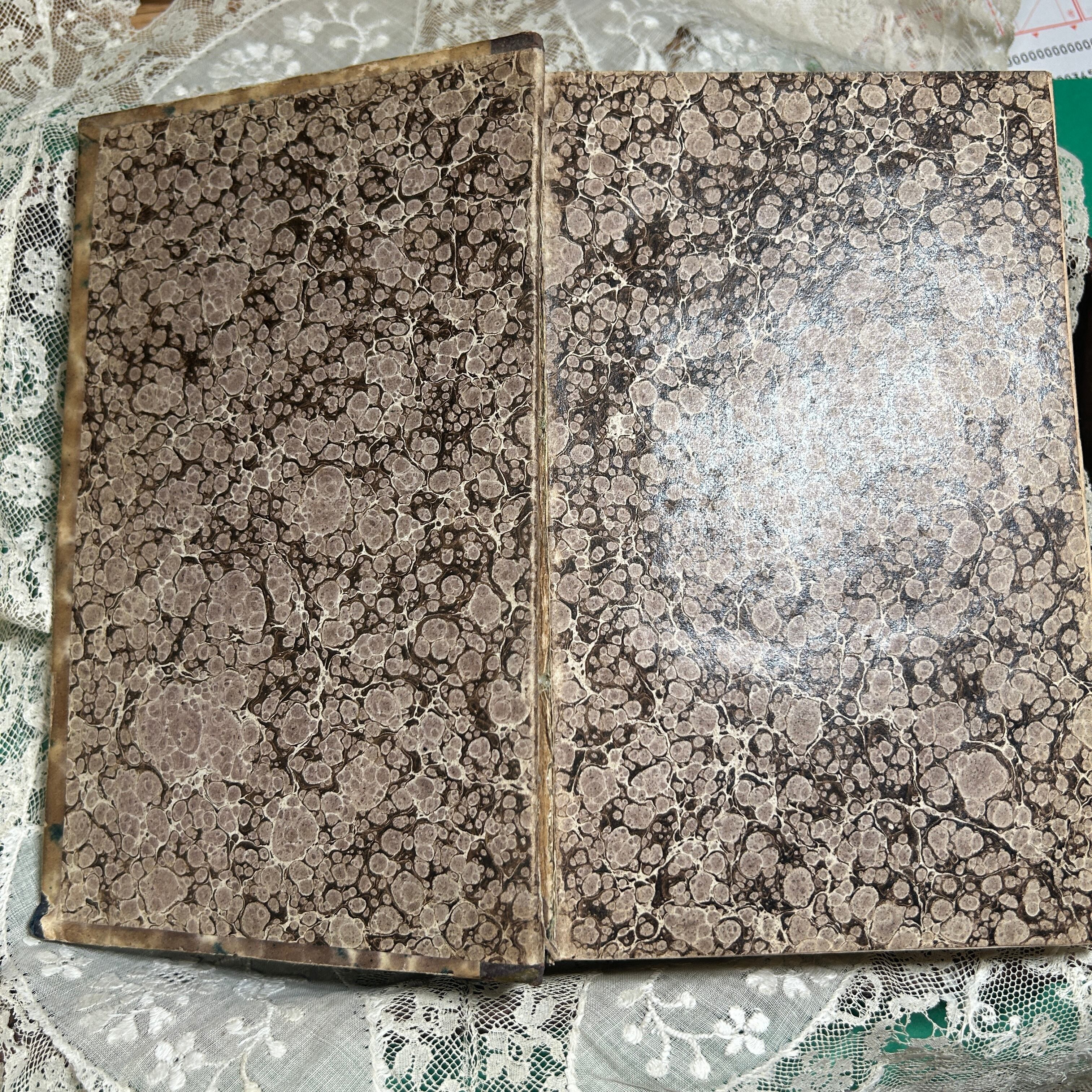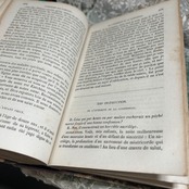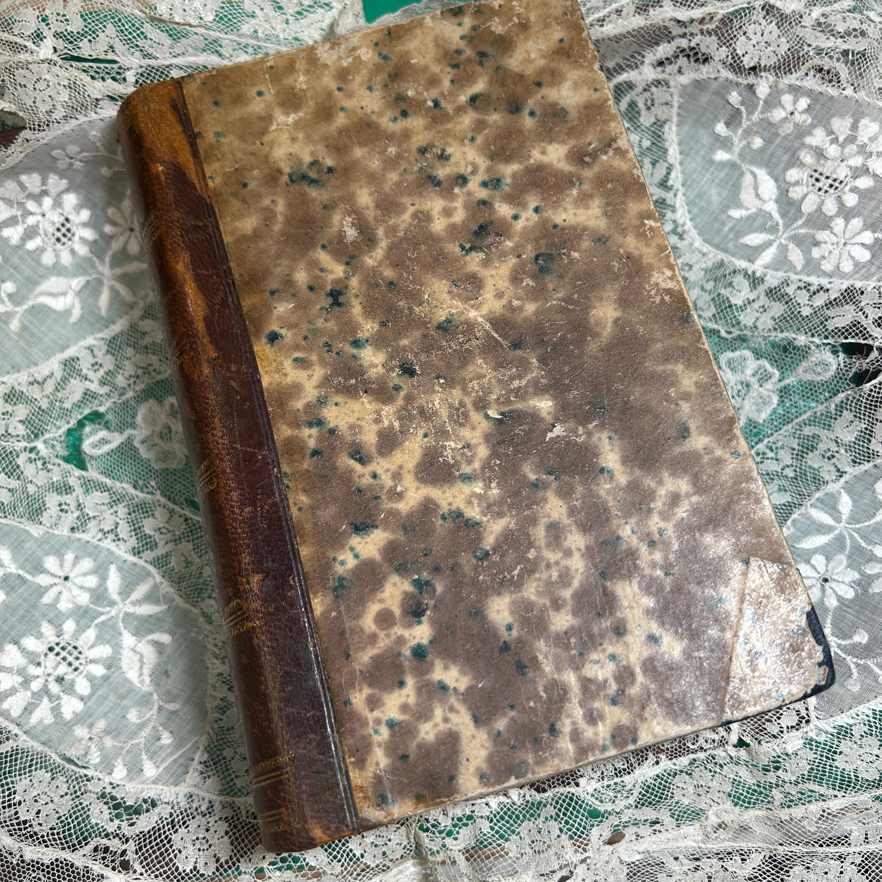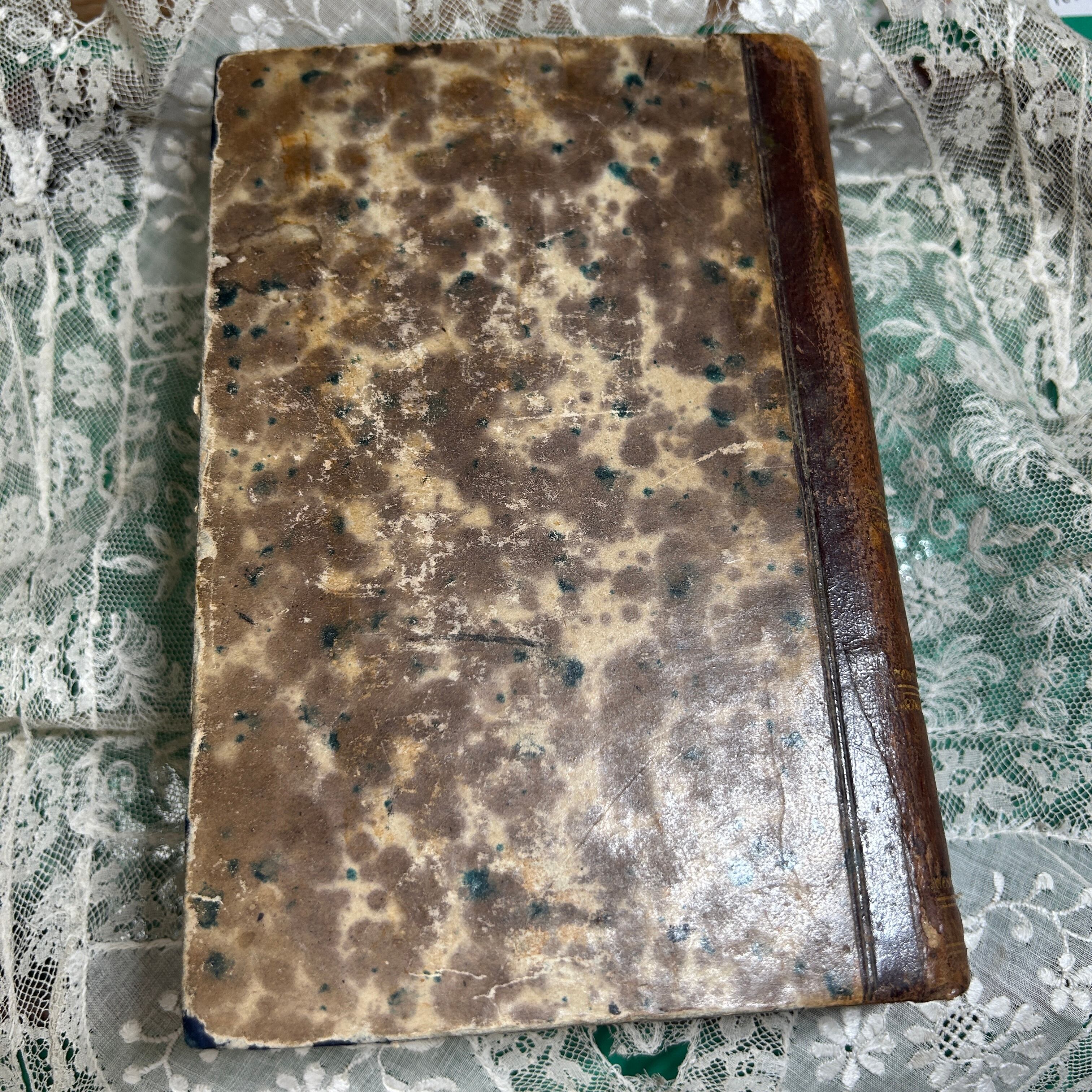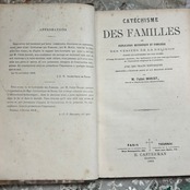 こちらは1862年に出版されたフランス語のカトリック教会の書籍『Catéchisme des Familles』(家庭向けカテキズム)です。表紙はアンティーク感漂う美しい大理石模様の紙で覆われており、背表紙は茶色のレザー仕上げに金箔の装飾が施された、重厚で高級感のある装丁が特徴です。年代を感じさせる色褪せやシミが、長い時を経てきた歴史的価値をさらに引き立てています。