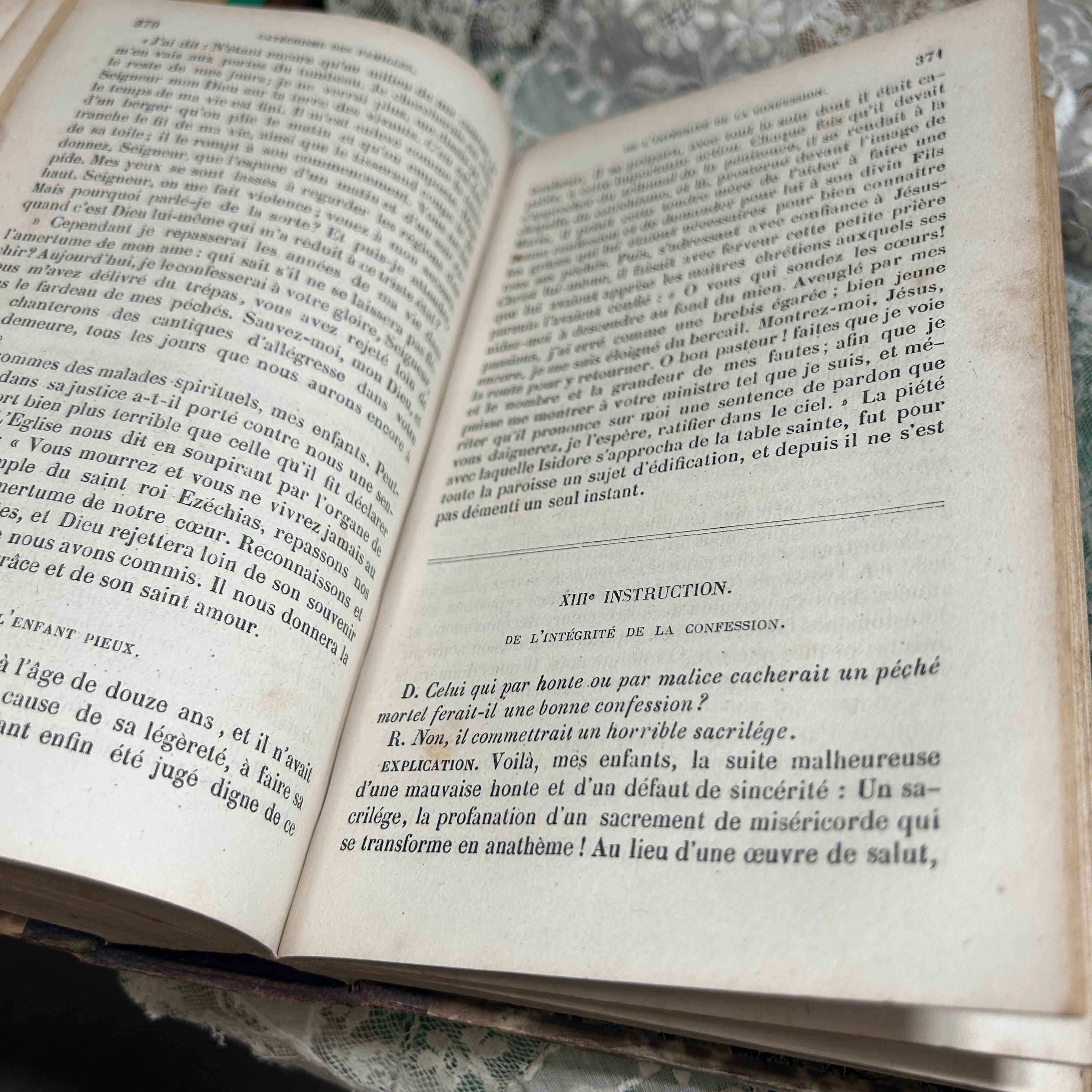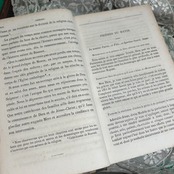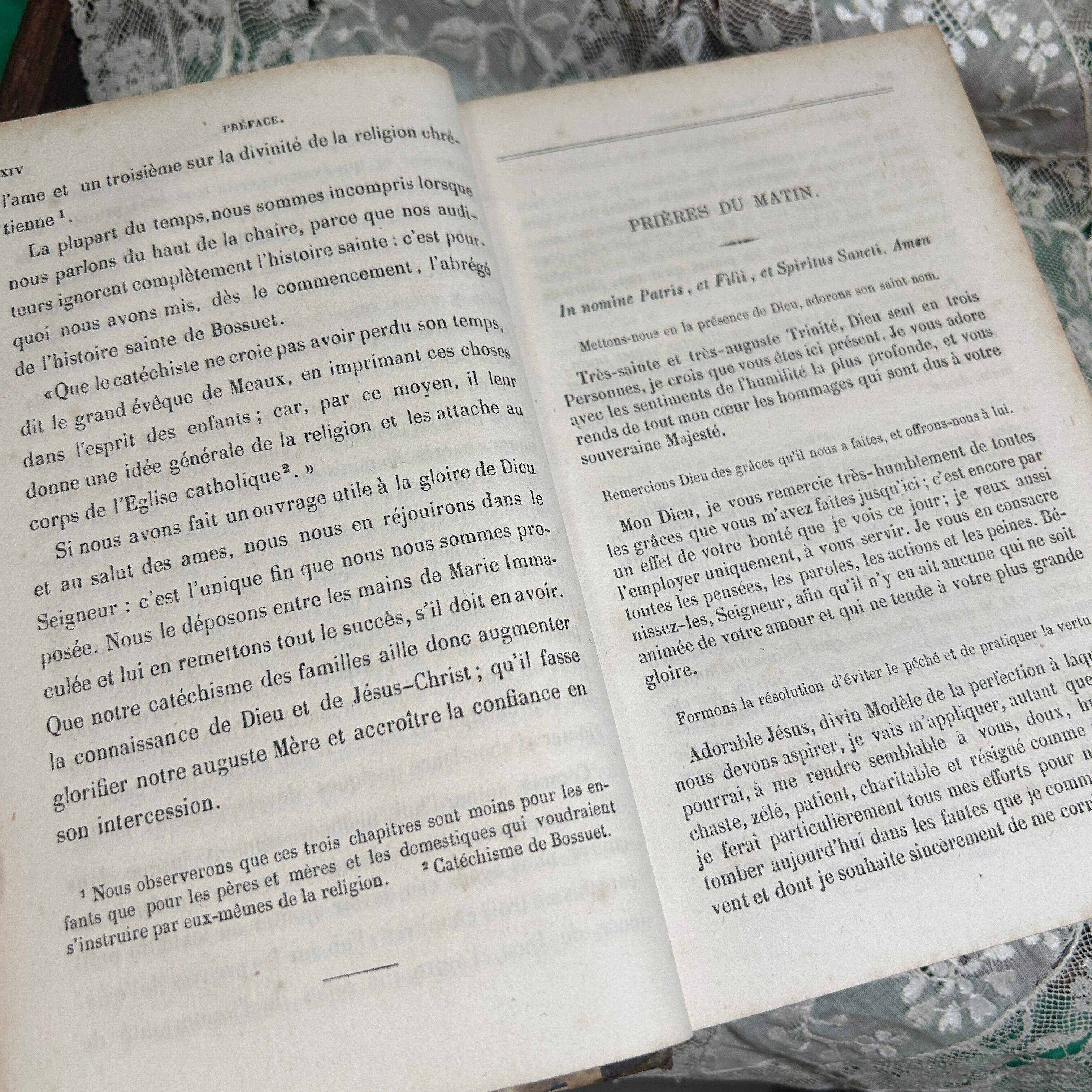 内容は、主にカトリックの家庭向けに書かれた宗教教育書であり、親や教育者が子どもたちに信仰を教えるための手引きとして使われていたことが伺えます。教えは非常に丁寧かつ体系的に記述されており、宗教の基本的な真理や道徳、礼拝の仕方、日々の祈りについて解説されています。文章はフランス語で、古典的なスタイルの美しい活字が使われています。