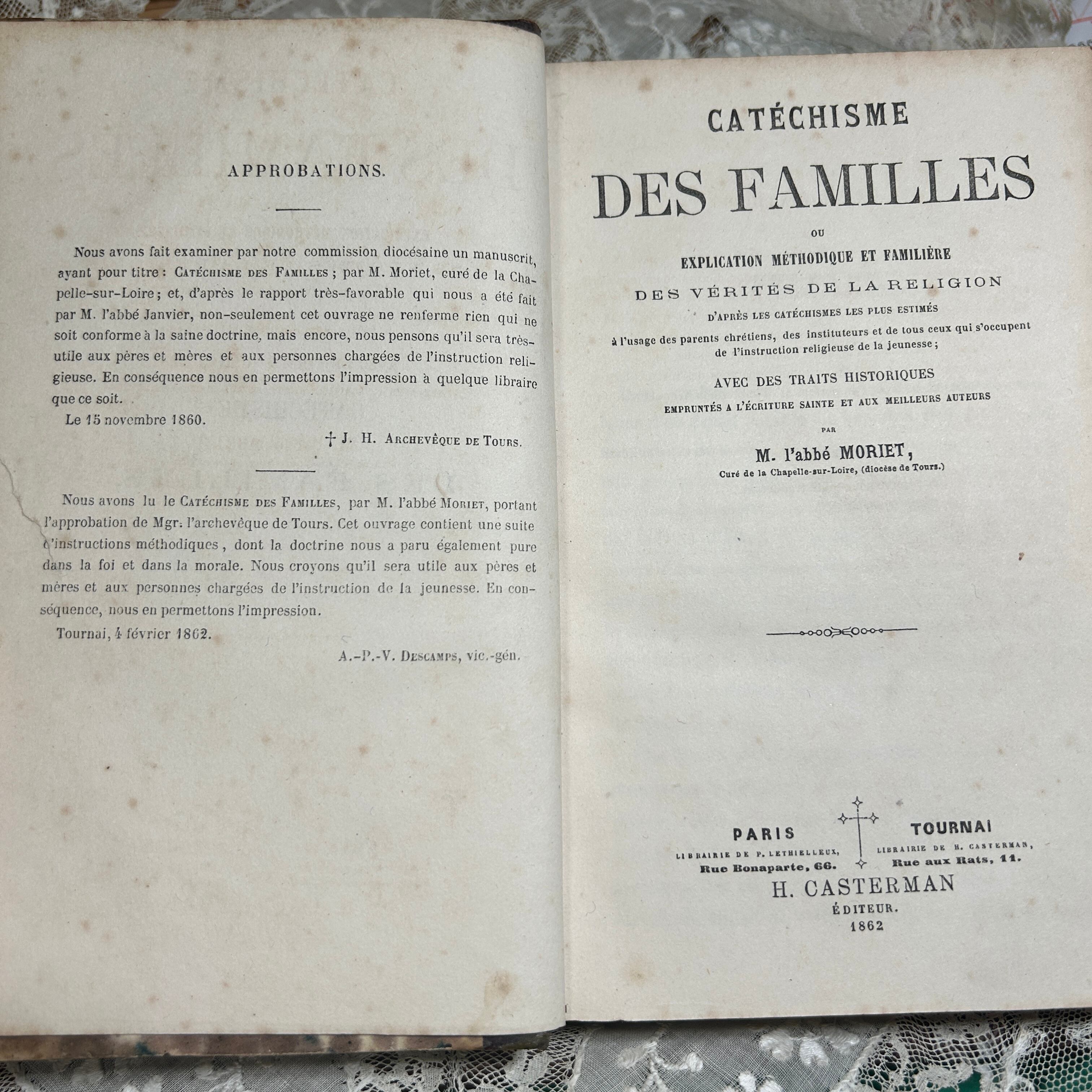 タイトルページには、「Catéchisme des Familles」の名称と著者名「M. l’abbé Moriet(モリエ神父)」が記載されています。出版は、H. Casterman(H. キャスターマン)社によるもので、1862年と明記されており、場所はフランス・パリおよびベルギー・トゥルネーとなっています。