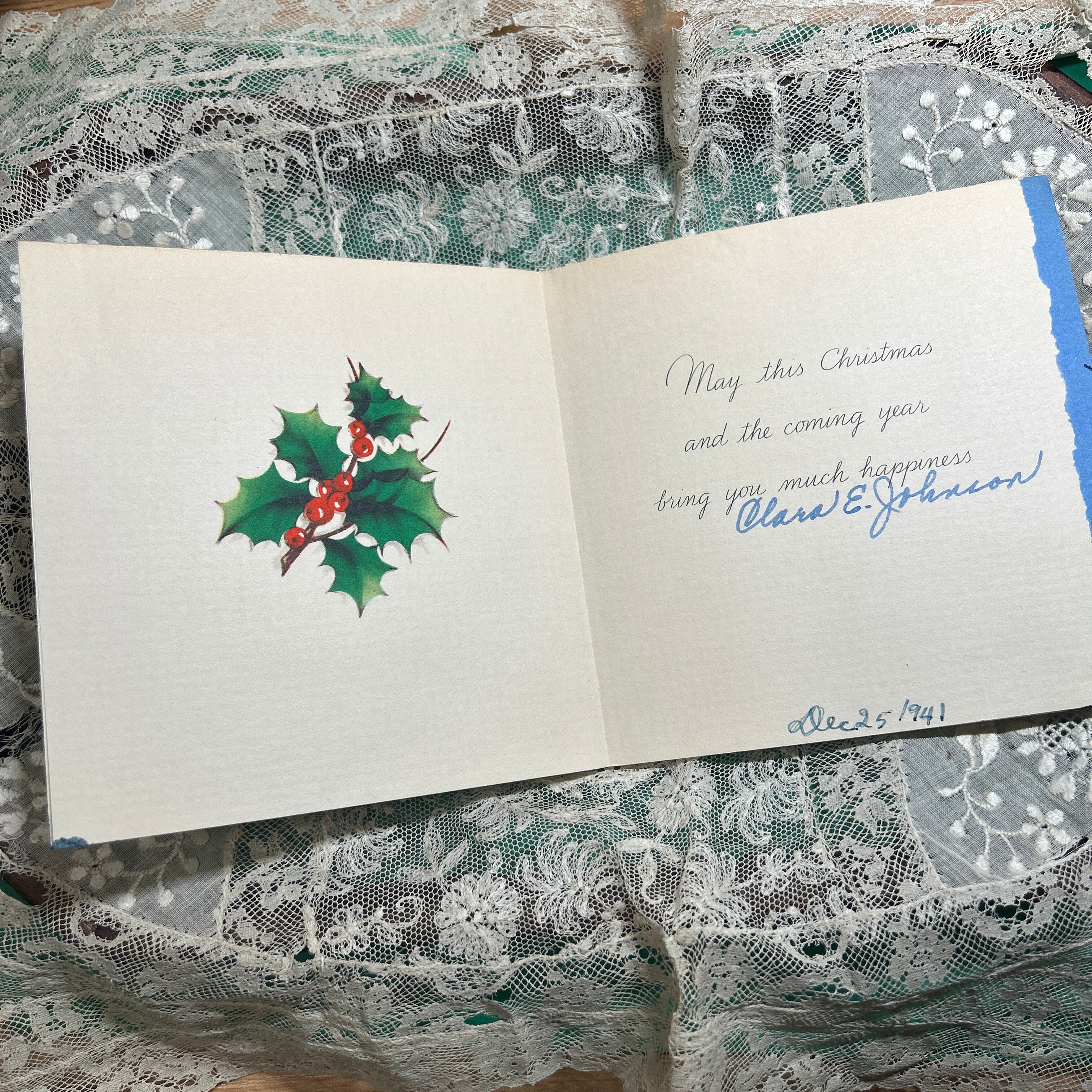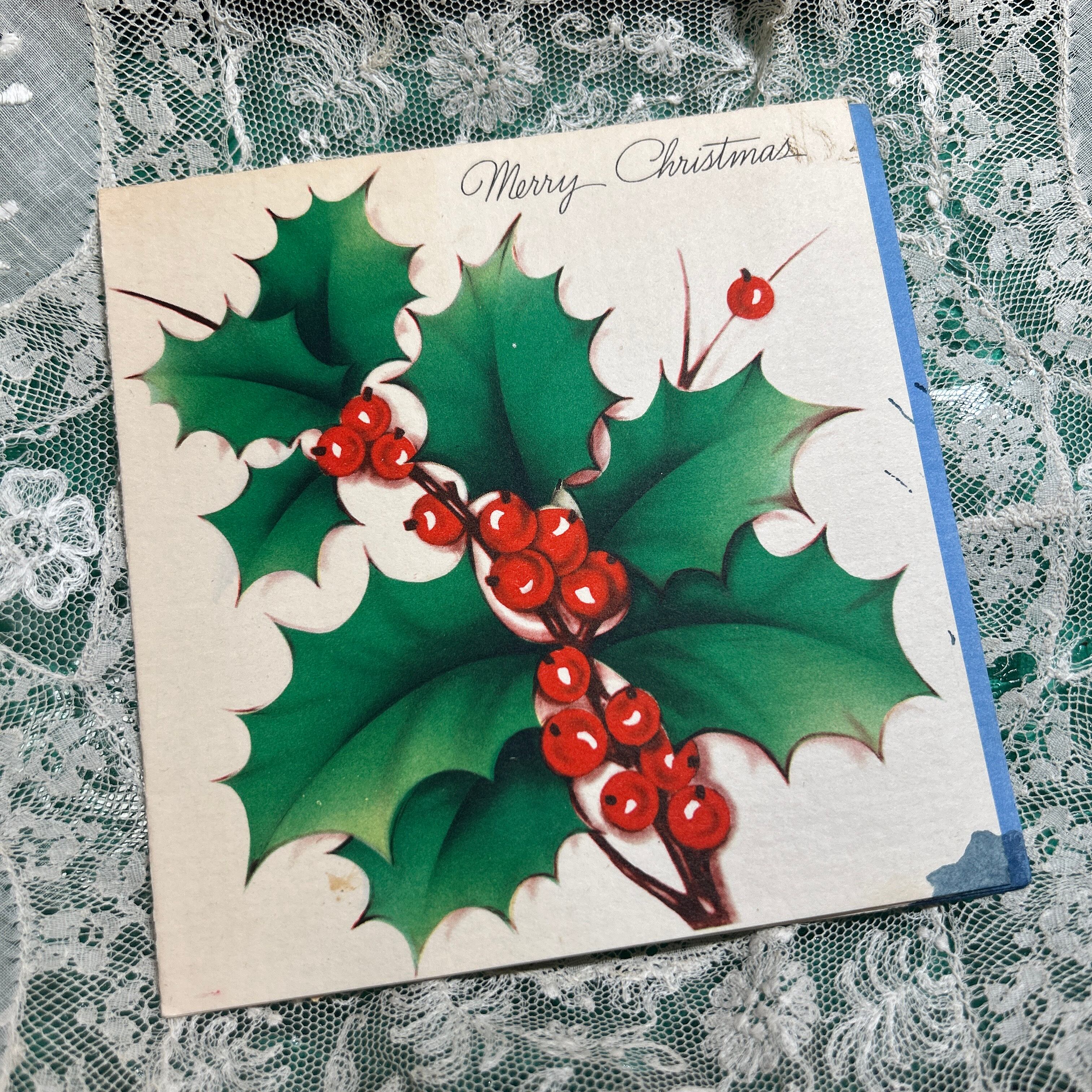 こちらは、ヒイラギが鮮やかに描かれたアンティークポストカードです。ヒイラギはクリスマスシーズンの象徴として長く愛されており、その赤い実ととげのある緑の葉は、家族や友人と過ごす特別な時間を彩るアイテムとして人気があります。ヨーロッパでは古代から邪悪なものを遠ざける力があると信じられ、家を守る植物としても用いられてきました。