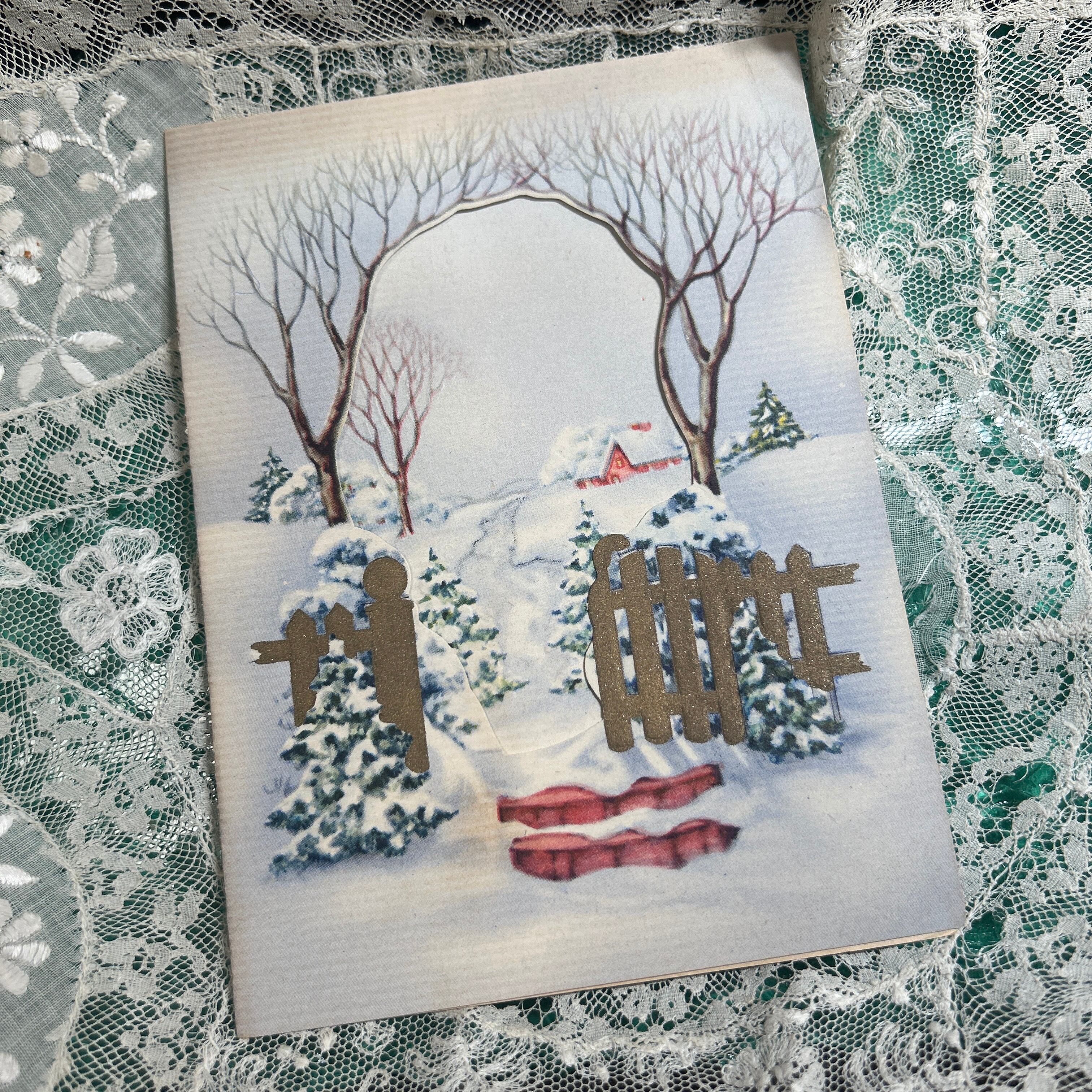 このヴィンテージのクリスマスカードは、雪に覆われた美しい冬景色を描いた、見る人の心を温かくする一枚です。雪の静けさとともに、寒い季節ならではの穏やかなひとときを感じさせるこのデザインは、特別な思いを込めて大切な人に贈るのにぴったりです。遠くに佇む雪景色の建物や、そっと舞い降りる雪の情景が描かれており、見る人をノスタルジックな気分に誘います。