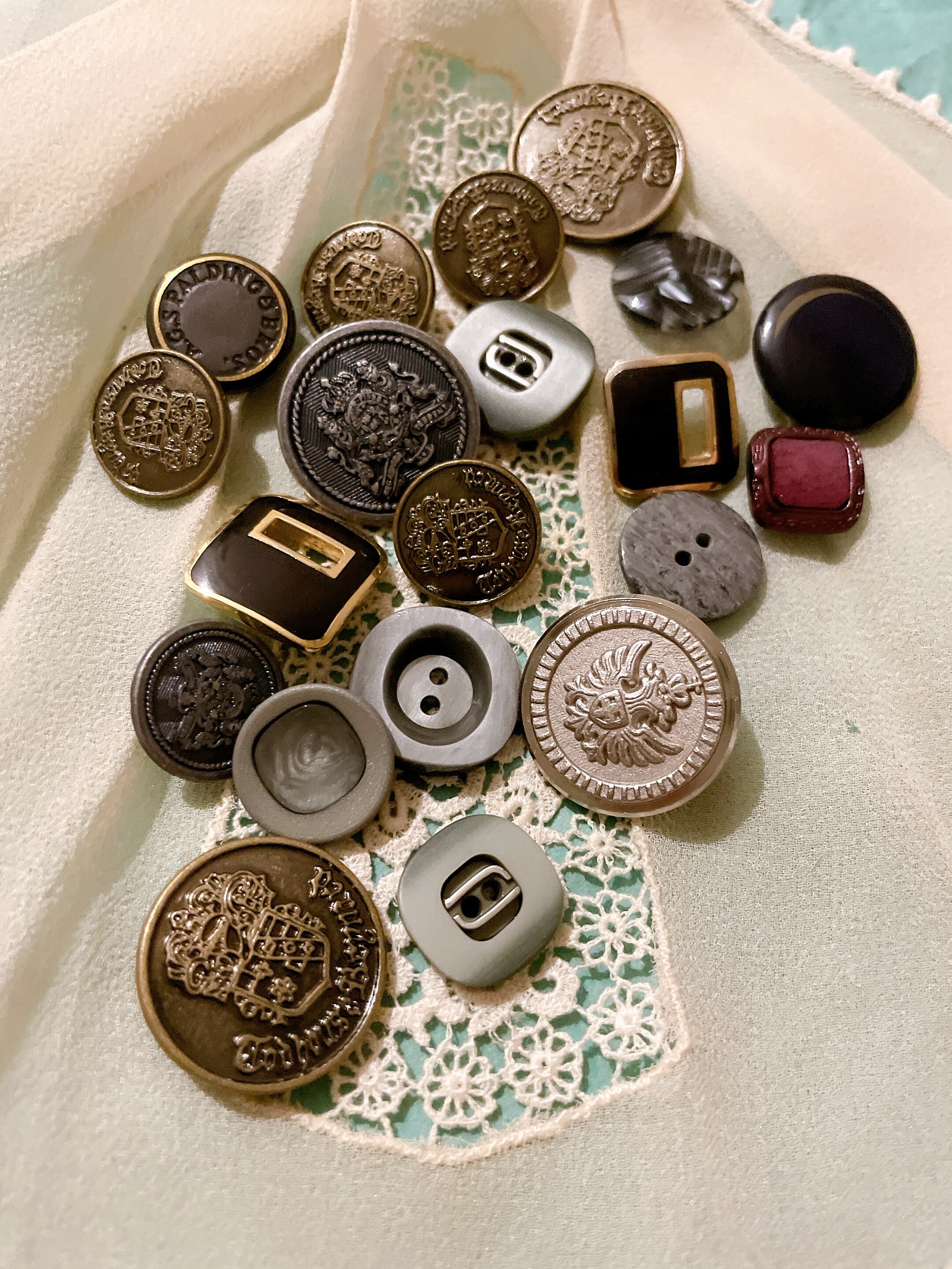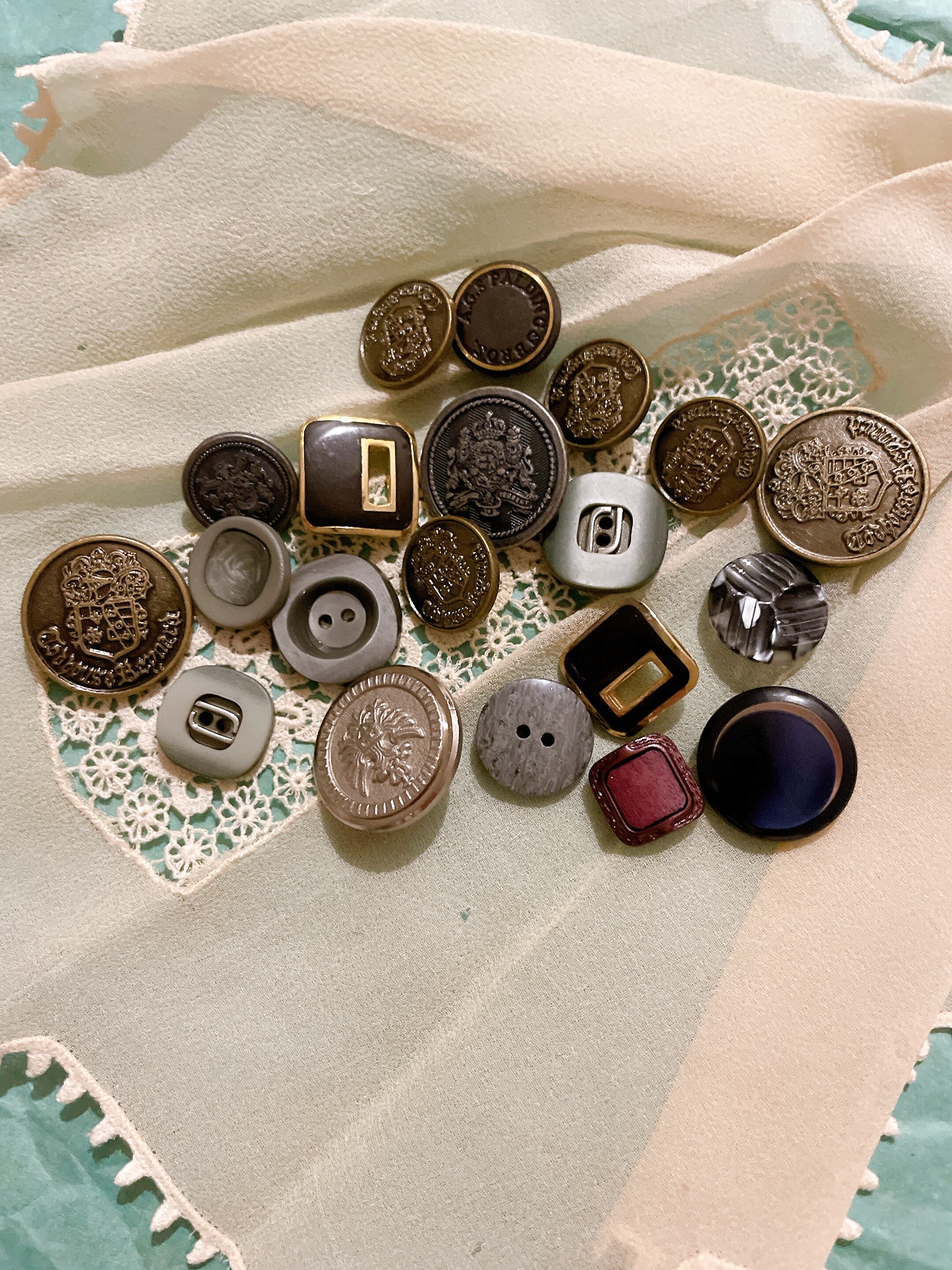 こちらは、シックな黒色を基調としたヴィンテージボタンのセットです。艶のある漆黒のデザインから、マットで落ち着いたトーンのものまで、さまざまな質感と形状が揃っており、どれもエレガントで洗練された印象を与えます。それぞれのボタンに細かな装飾が施されており、ヴィンテージ特有の深みと存在感を感じることができます。