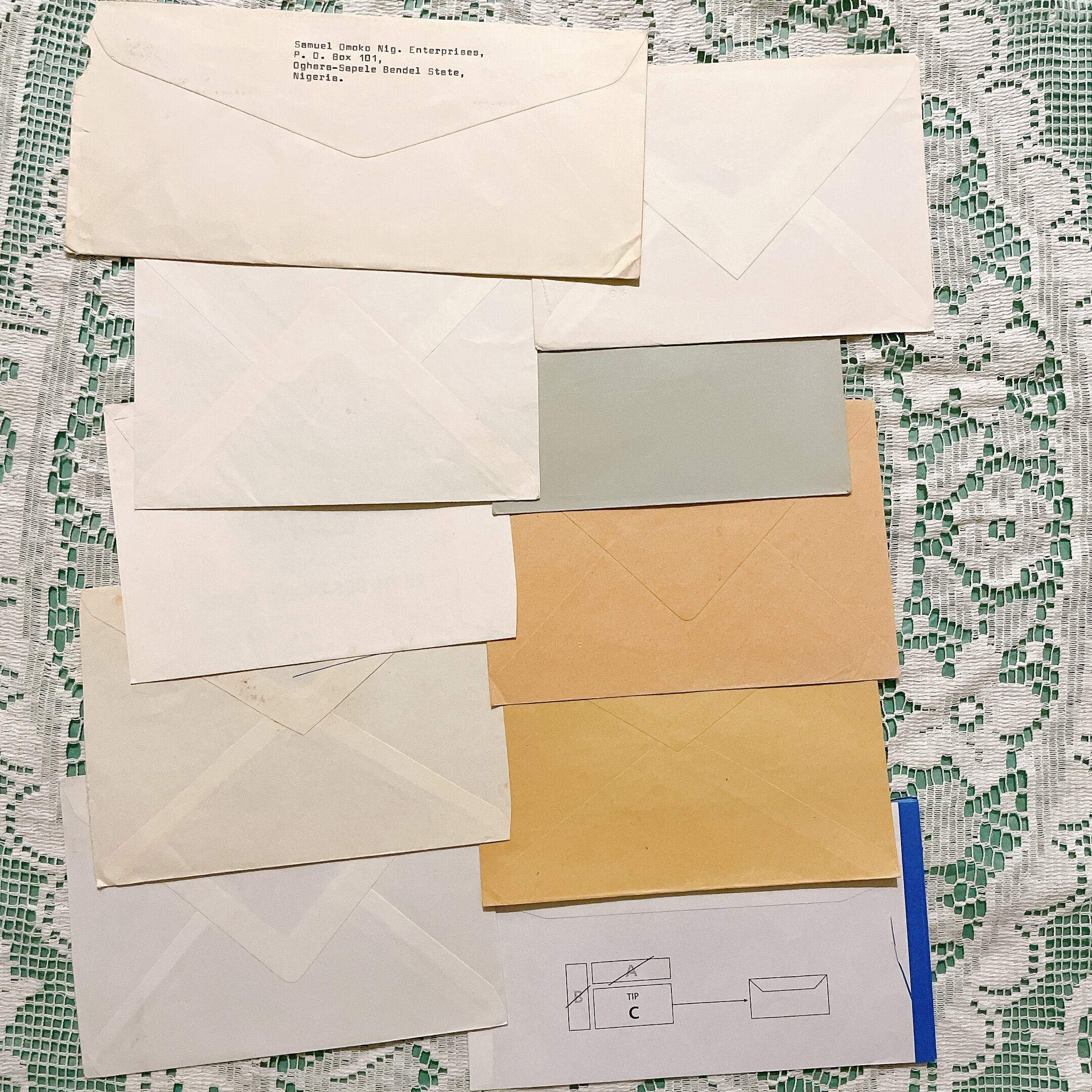 こちらは、世界中から集めたシンプルな封筒10枚セットです。各封筒には、それぞれ異なる国の切手や消印が施されており、歴史的な背景や国際交流の息吹を感じられるアイテムとなっています。ビンテージならではの経年変化が味わい深く、紙の質感や印刷の風合いが一層特別感を引き立てます。