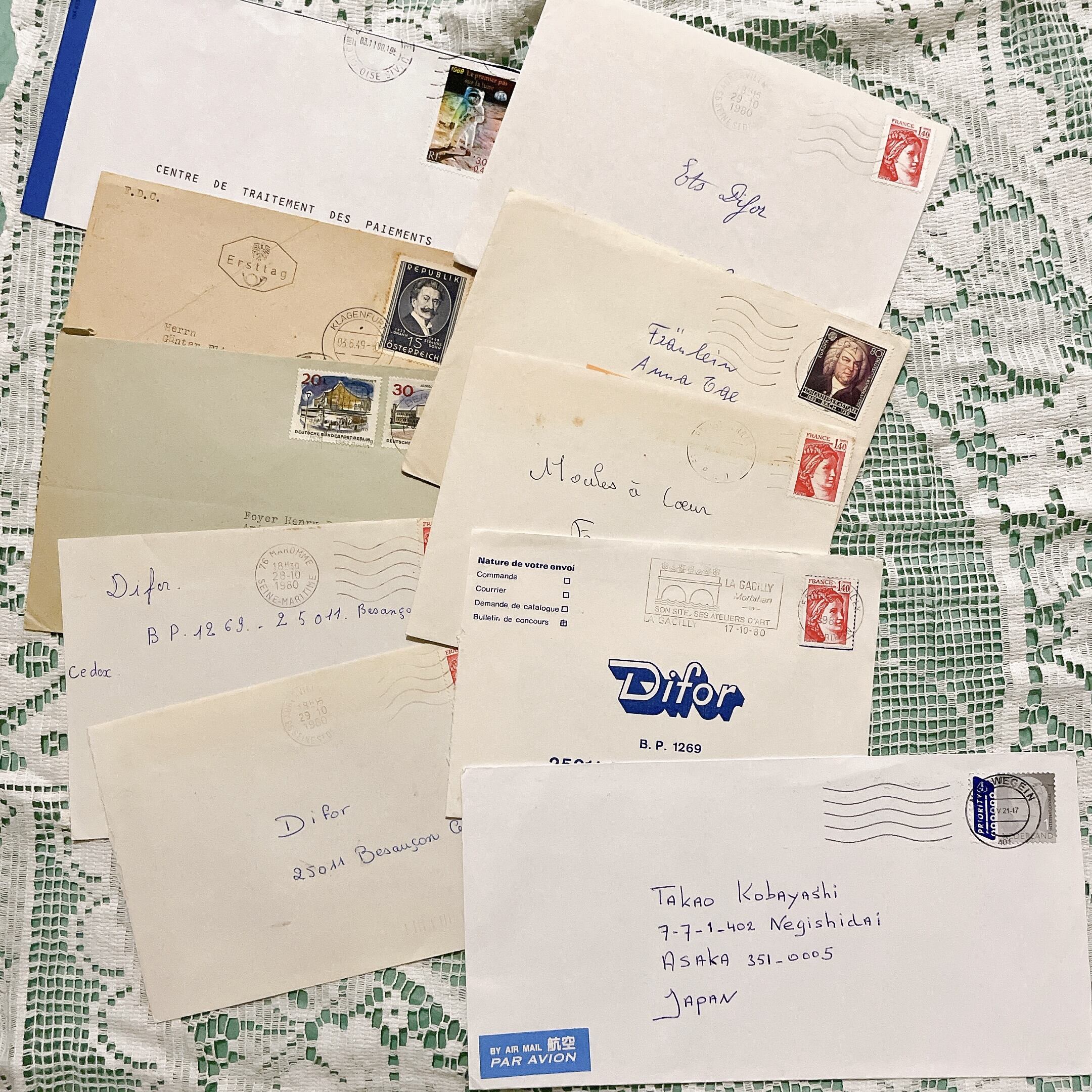 こちらは、世界中から集めたシンプルな封筒10枚セットです。各封筒には、それぞれ異なる国の切手や消印が施されており、歴史的な背景や国際交流の息吹を感じられるアイテムとなっています。ビンテージならではの経年変化が味わい深く、紙の質感や印刷の風合いが一層特別感を引き立てます。
