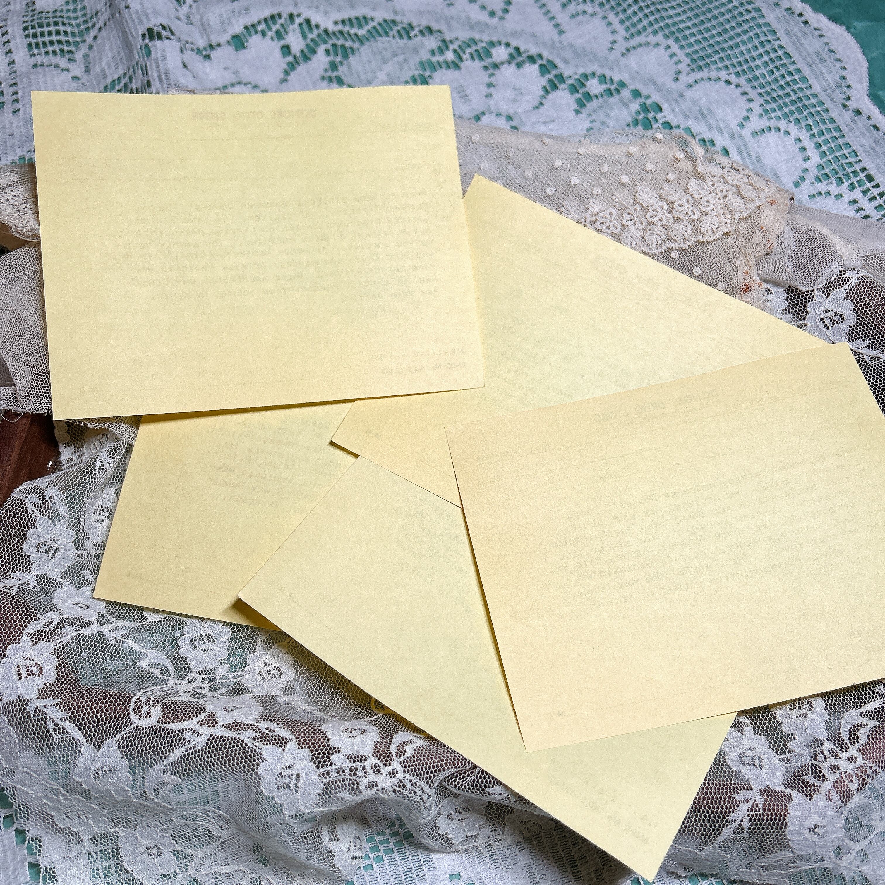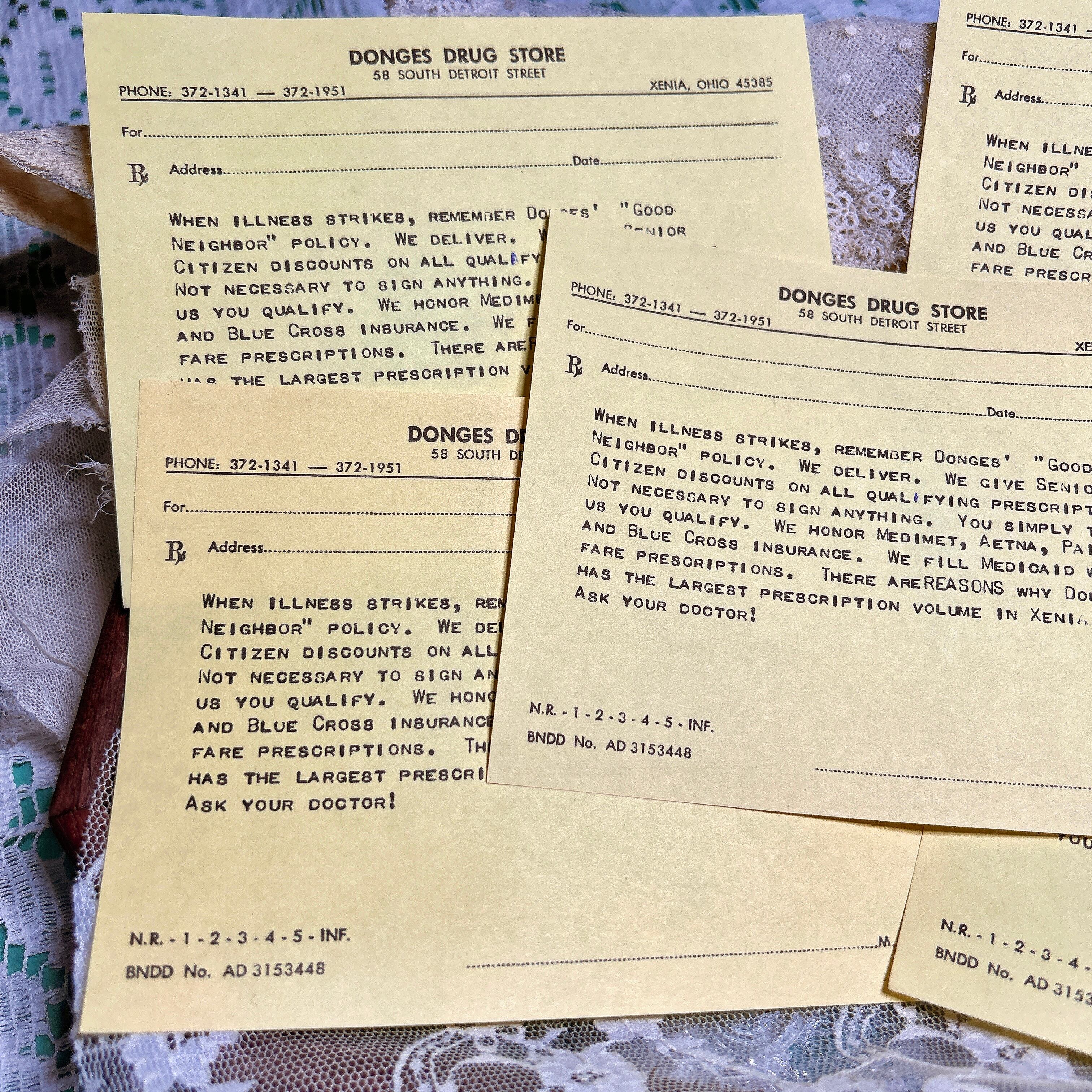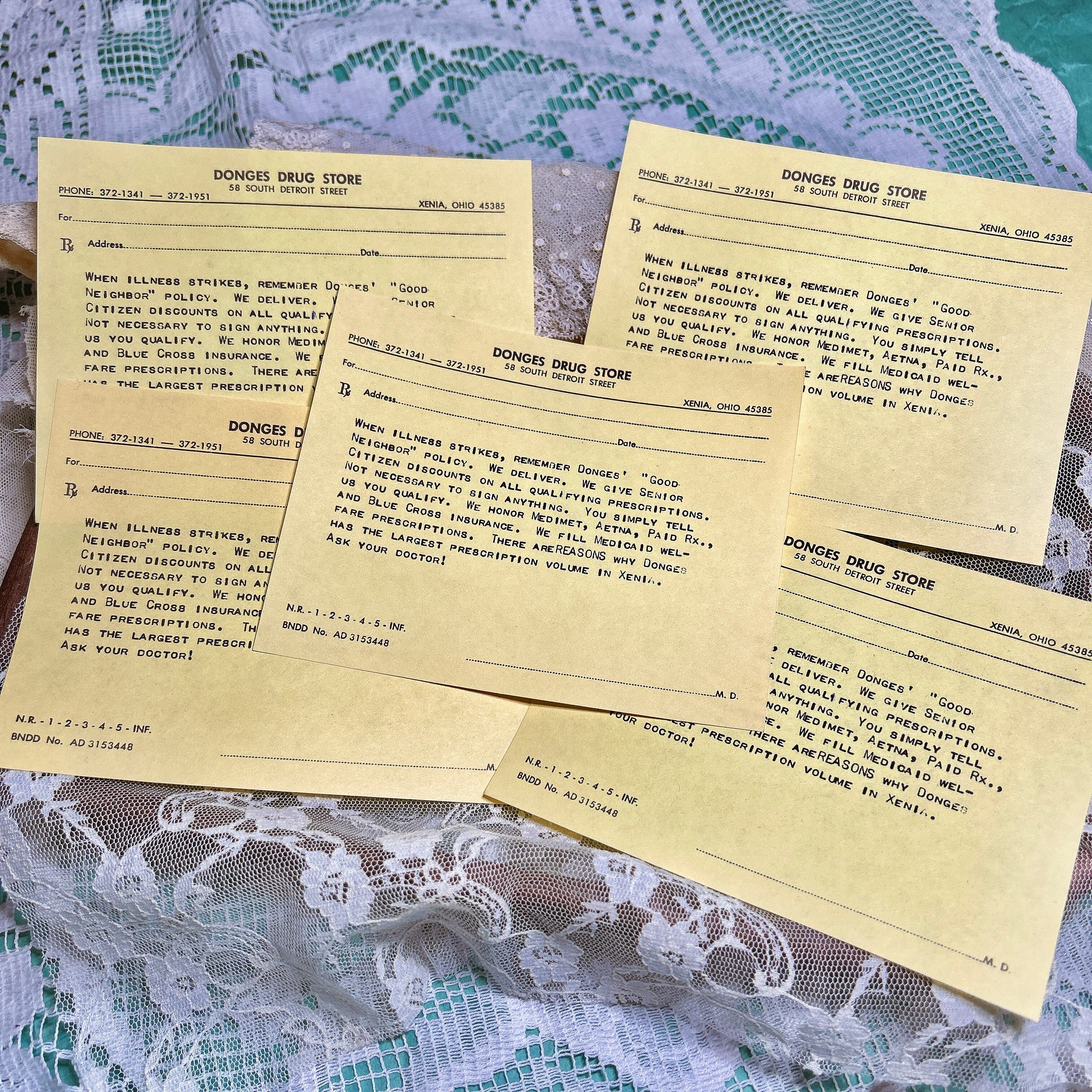 こちらの商品は、アメリカの老舗薬局「Donges Drug Store」のヴィンテージ処方箋用紙5枚セットです。サイズは14×11cmで、1950〜60年代頃に使用されていたものと思われます。紙は薄く、アメリカらしい黄色がかった色合いが特徴的。古いタイプライターで印字された独特のフォントや、当時の薬局の広告がそのまま記載されている点が魅力です。