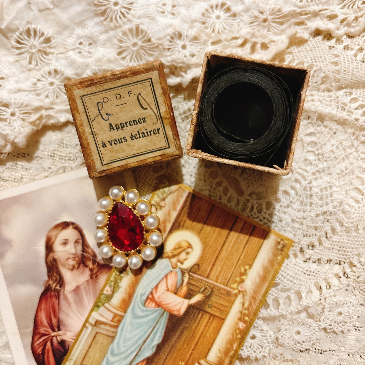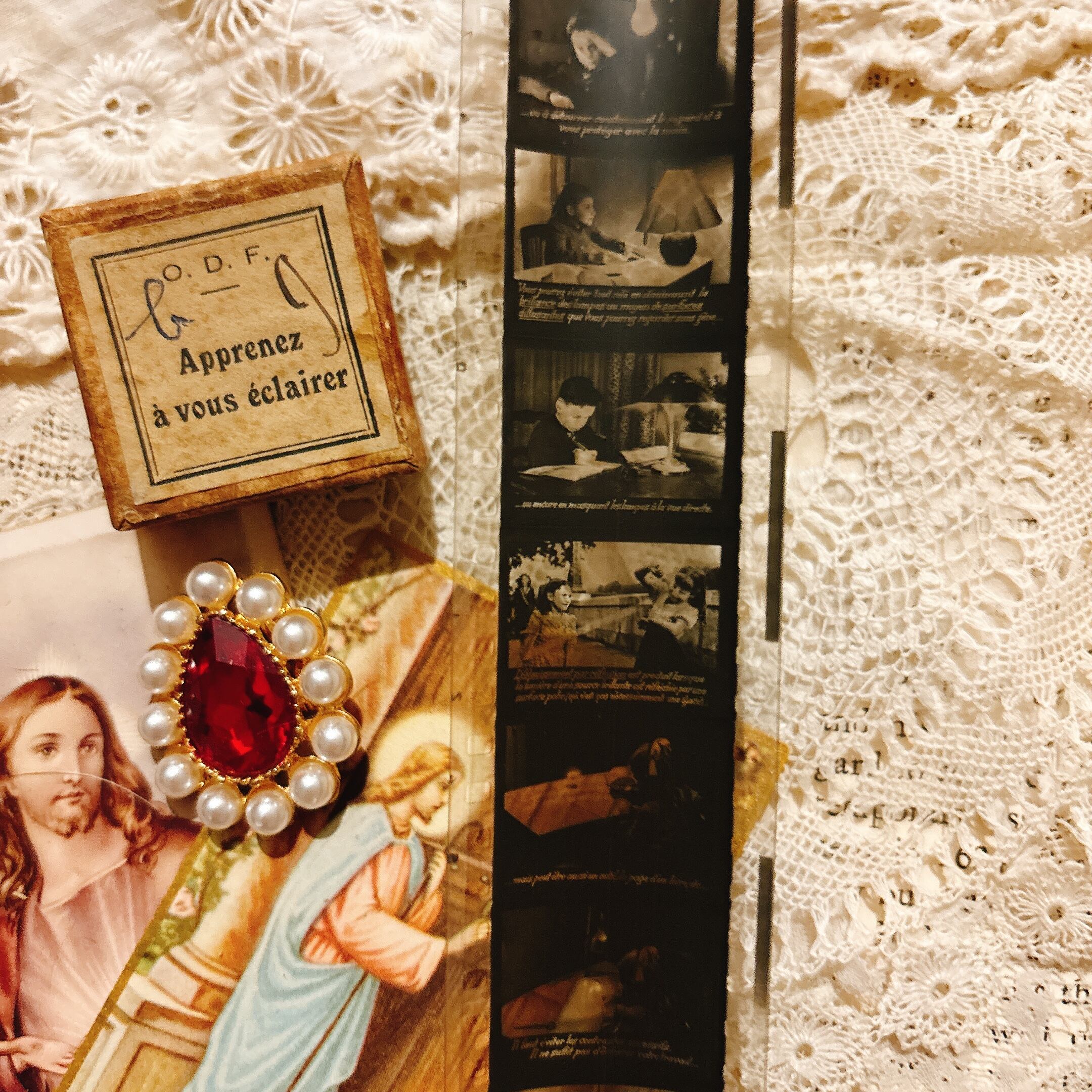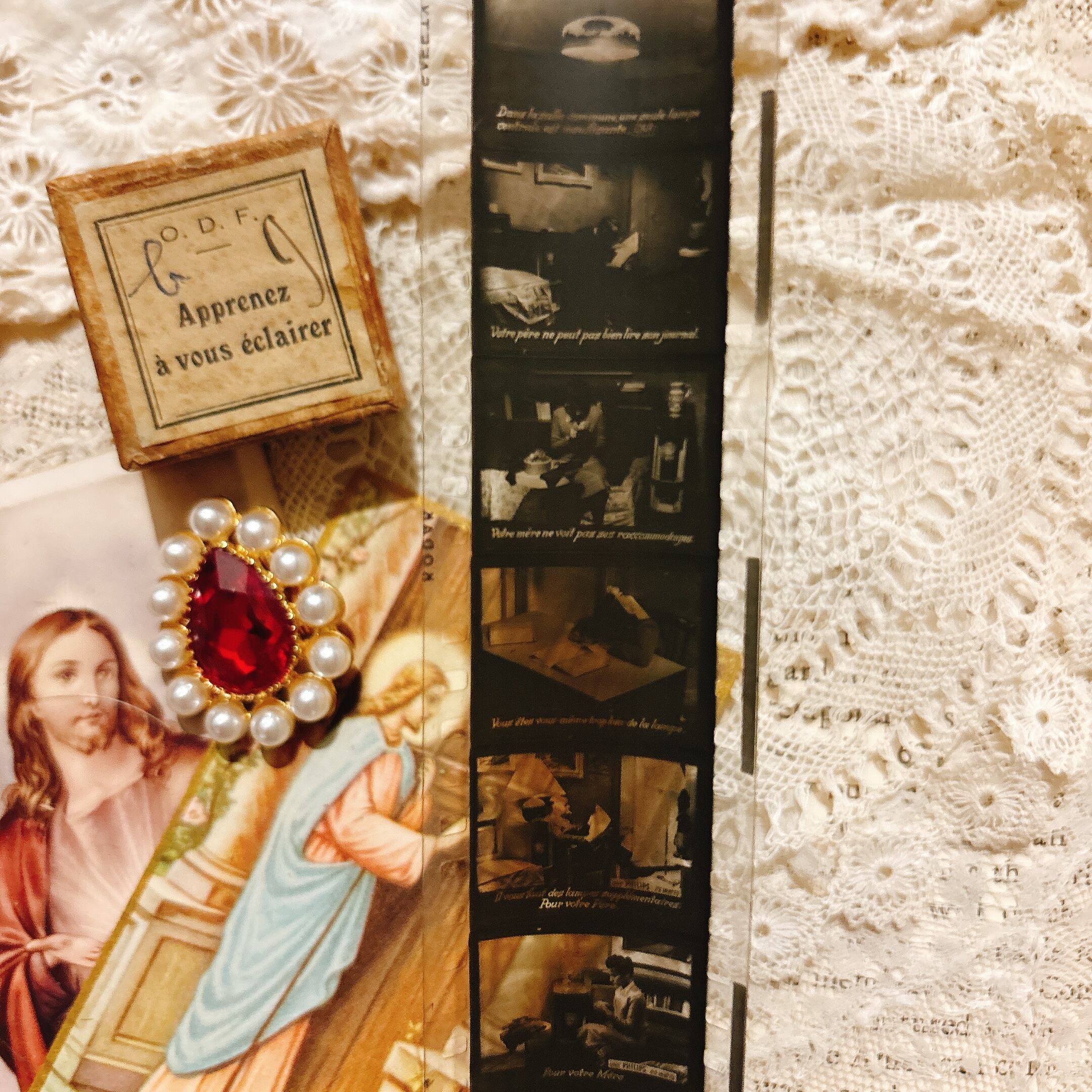 フィルムのケースにはフランス語でタイトルが記載されており、それぞれ異なる内容が含まれています。こちらのタイトルは「apprenez à vous éclairer」。自学自習という意味で、女の子が勉強する様子がフィルムに残っております。