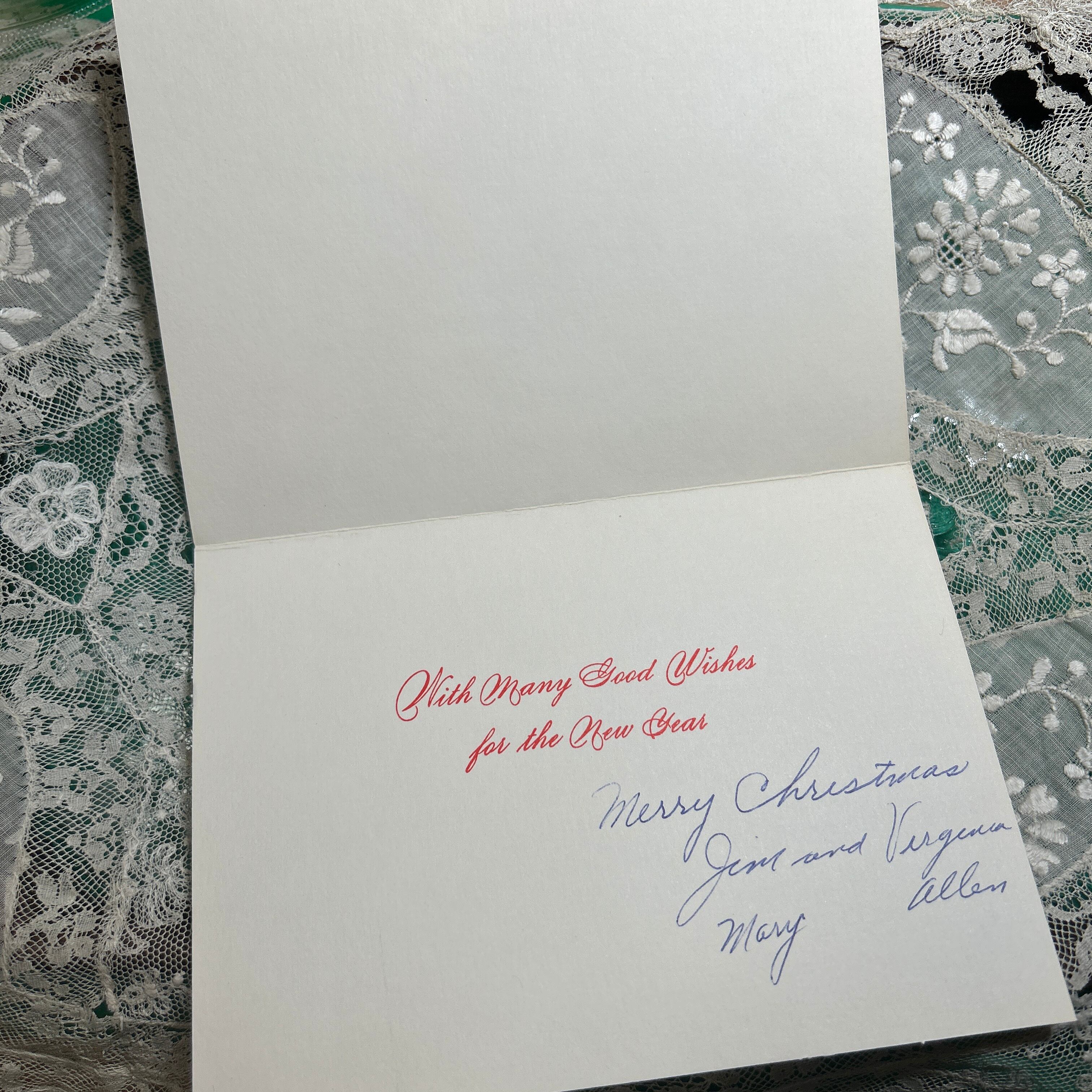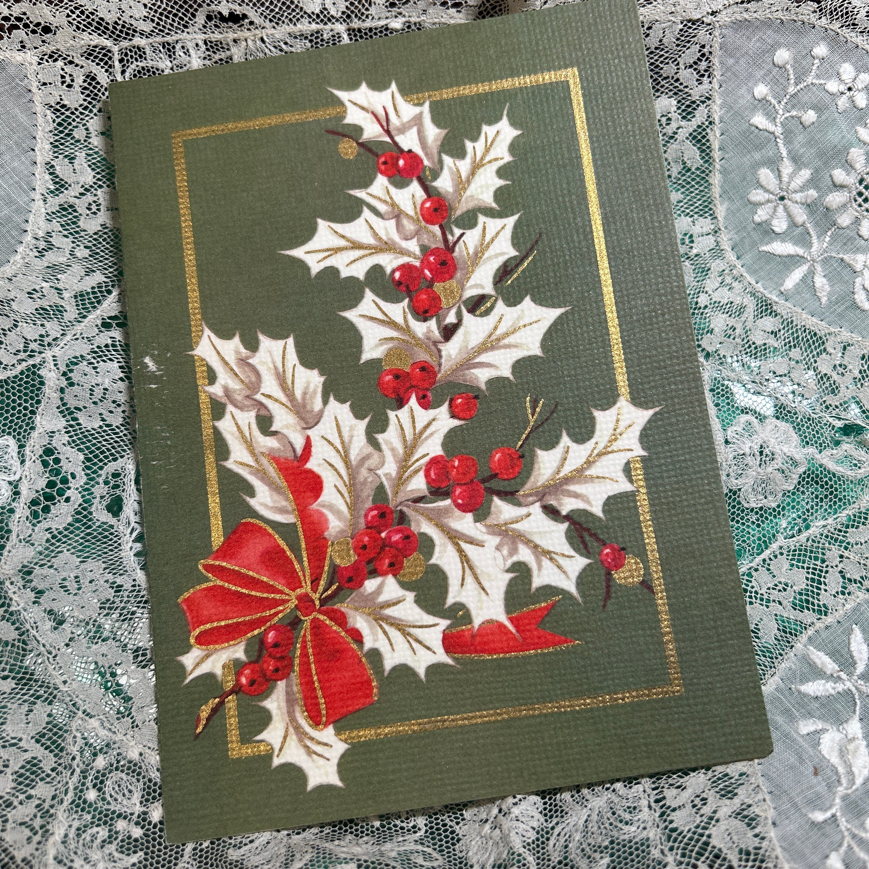 こちらは、ヒイラギが鮮やかに描かれたアンティークポストカードです。ヒイラギはクリスマスシーズンの象徴として長く愛されており、その赤い実ととげのある緑の葉は、家族や友人と過ごす特別な時間を彩るアイテムとして人気があります。ヨーロッパでは古代から邪悪なものを遠ざける力があると信じられ、家を守る植物としても用いられてきました。