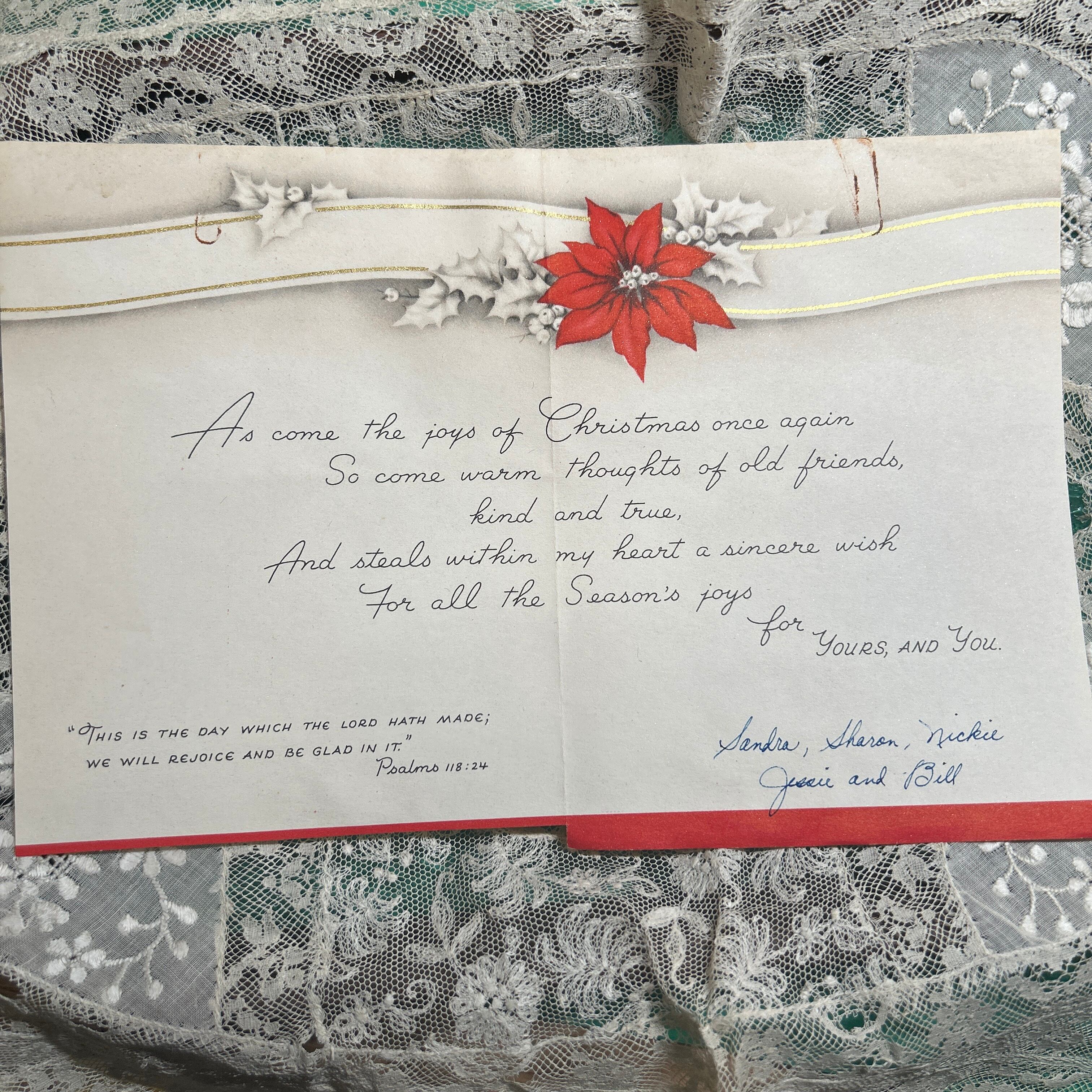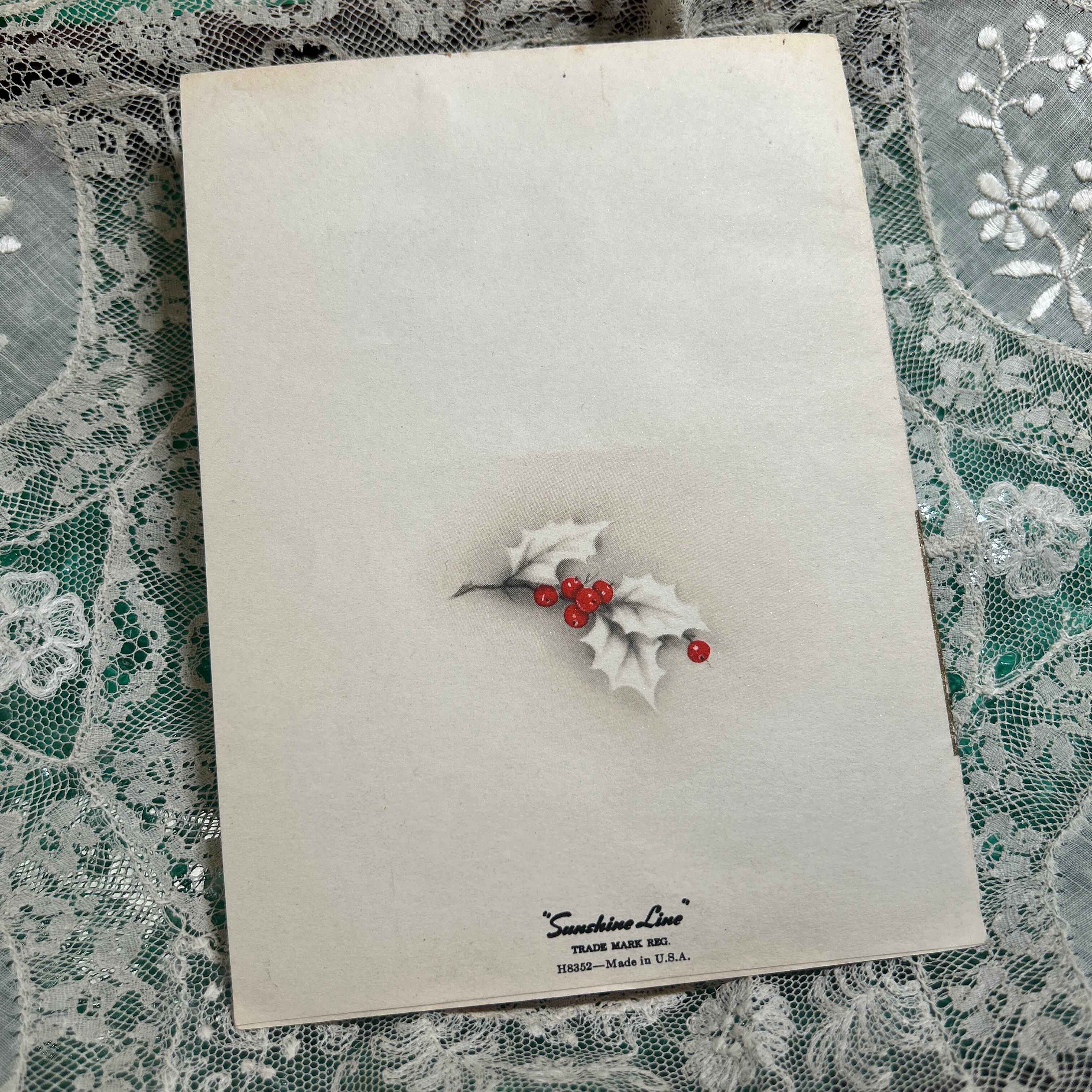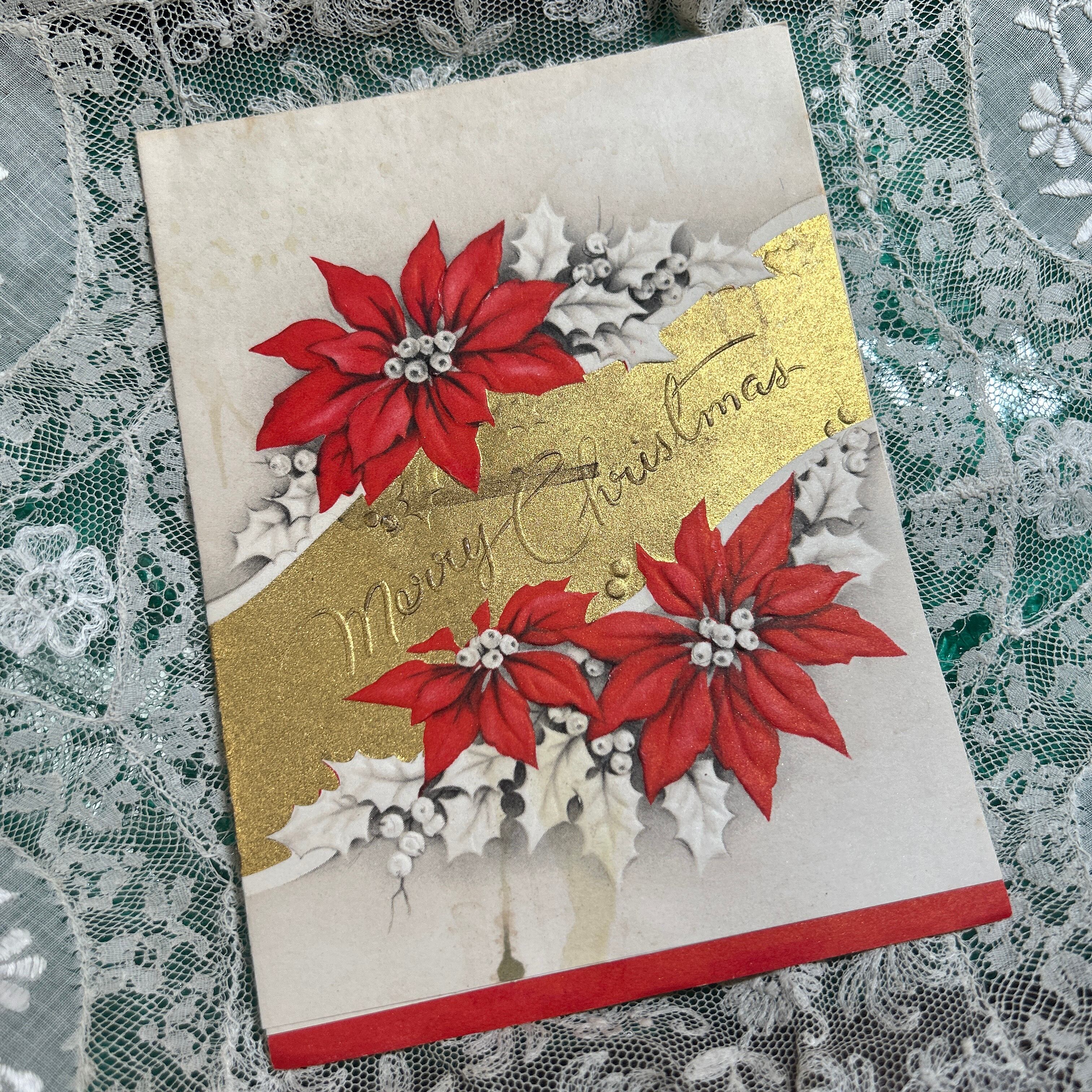 カードのデザインは、手作業で彩色されたようなヴィンテージの風合いが魅力的で、上質な紙に印刷されています。特にポインセチアの赤と緑のコントラストが、クリスマスシーズンの暖かさと華やかさを感じさせます。