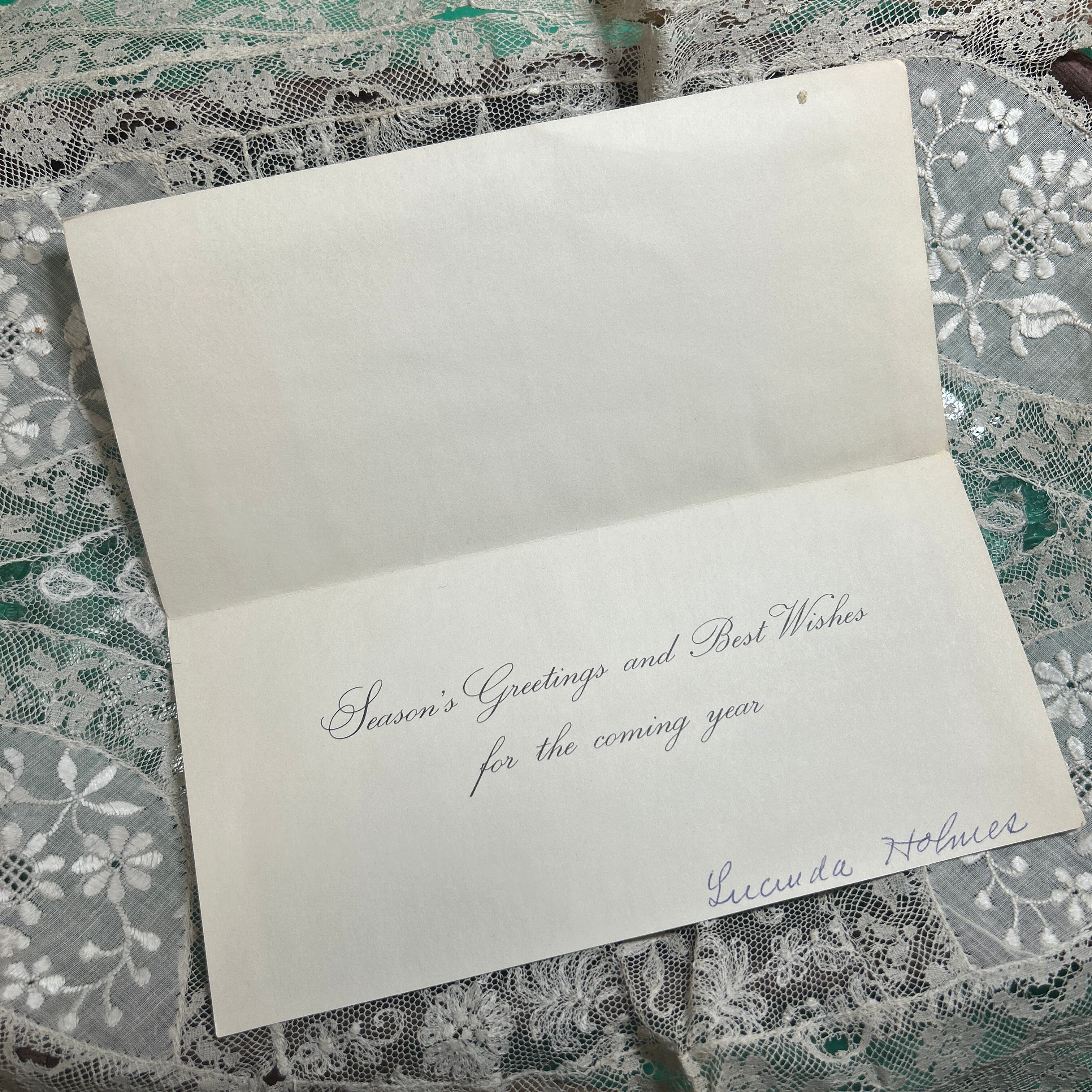 カードのデザインは、手作業で彩色されたようなヴィンテージの風合いが魅力的で、上質な紙に印刷されています。特にポインセチアの赤と緑のコントラストが、クリスマスシーズンの暖かさと華やかさを感じさせます。