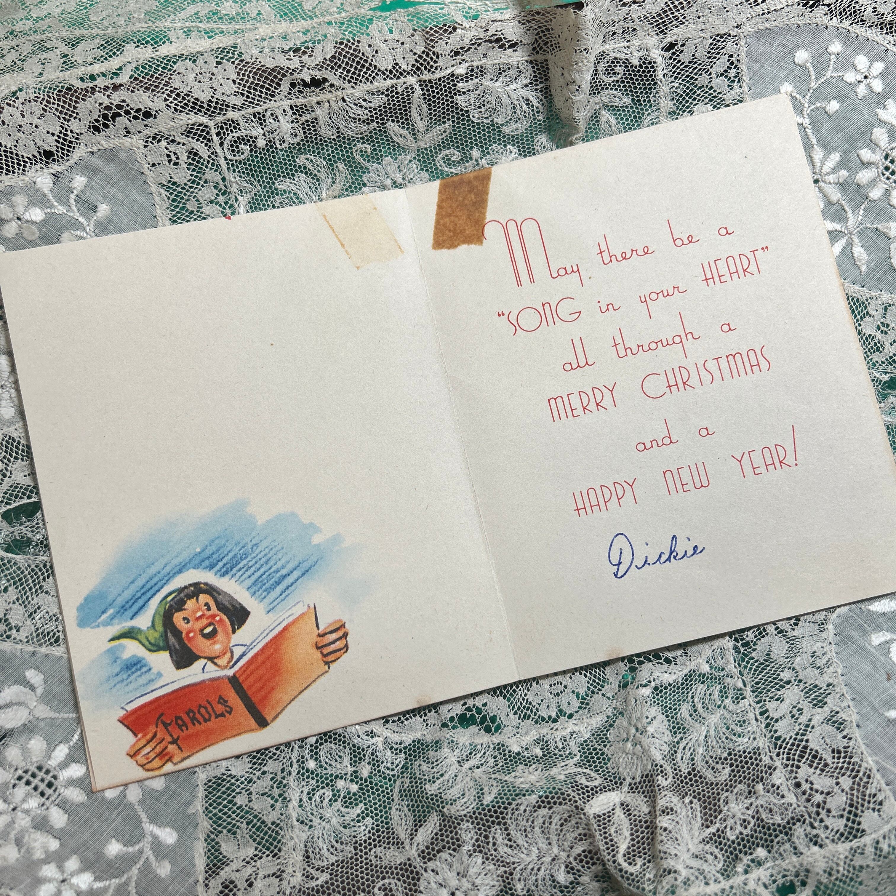 このヴィンテージのクリスマスカードは、子供や少女をテーマにした温かみのあるデザインが特徴です。無邪気な表情や夢見るようなシーンが描かれたこのカードは、見る人の心に懐かしさと幸福感を届けます。