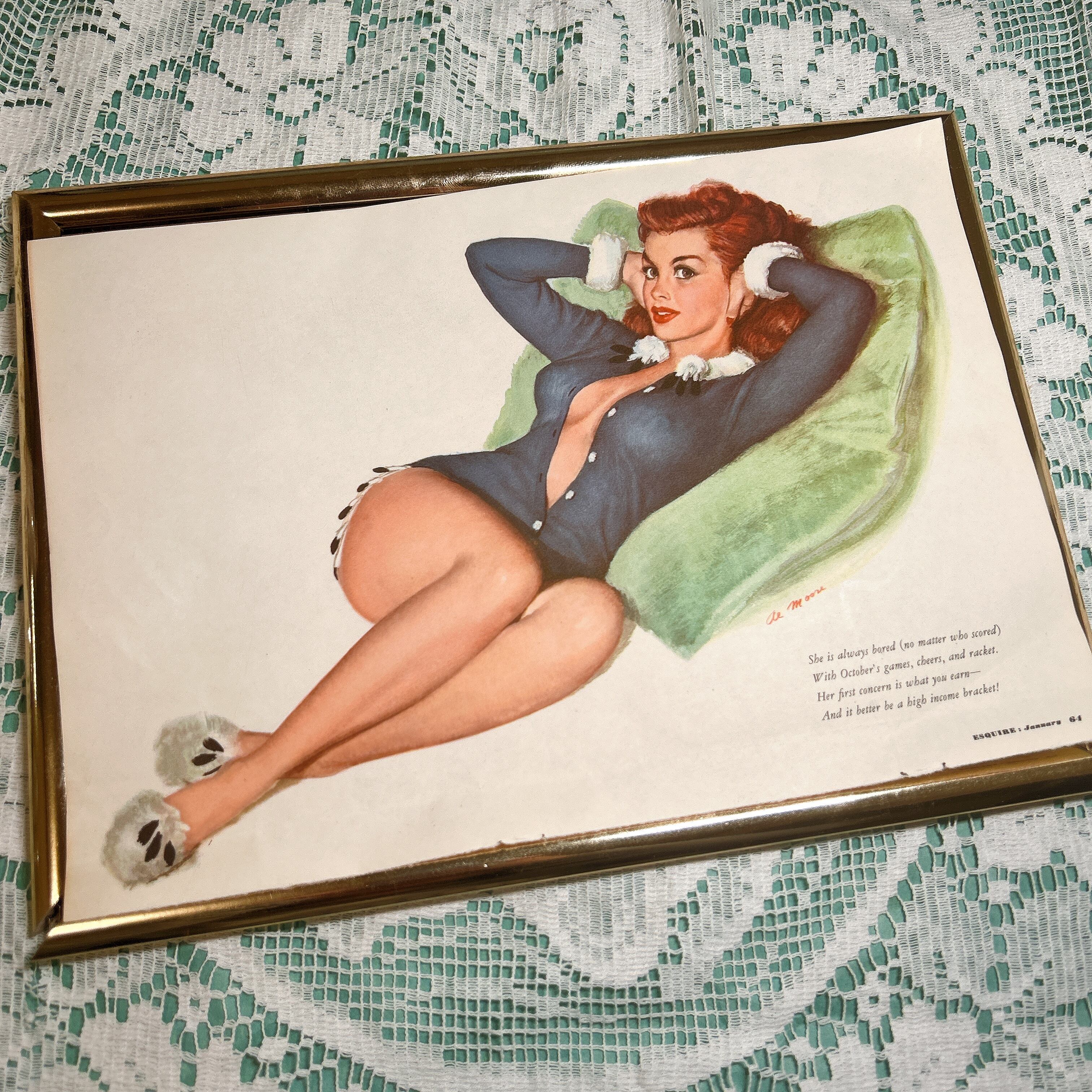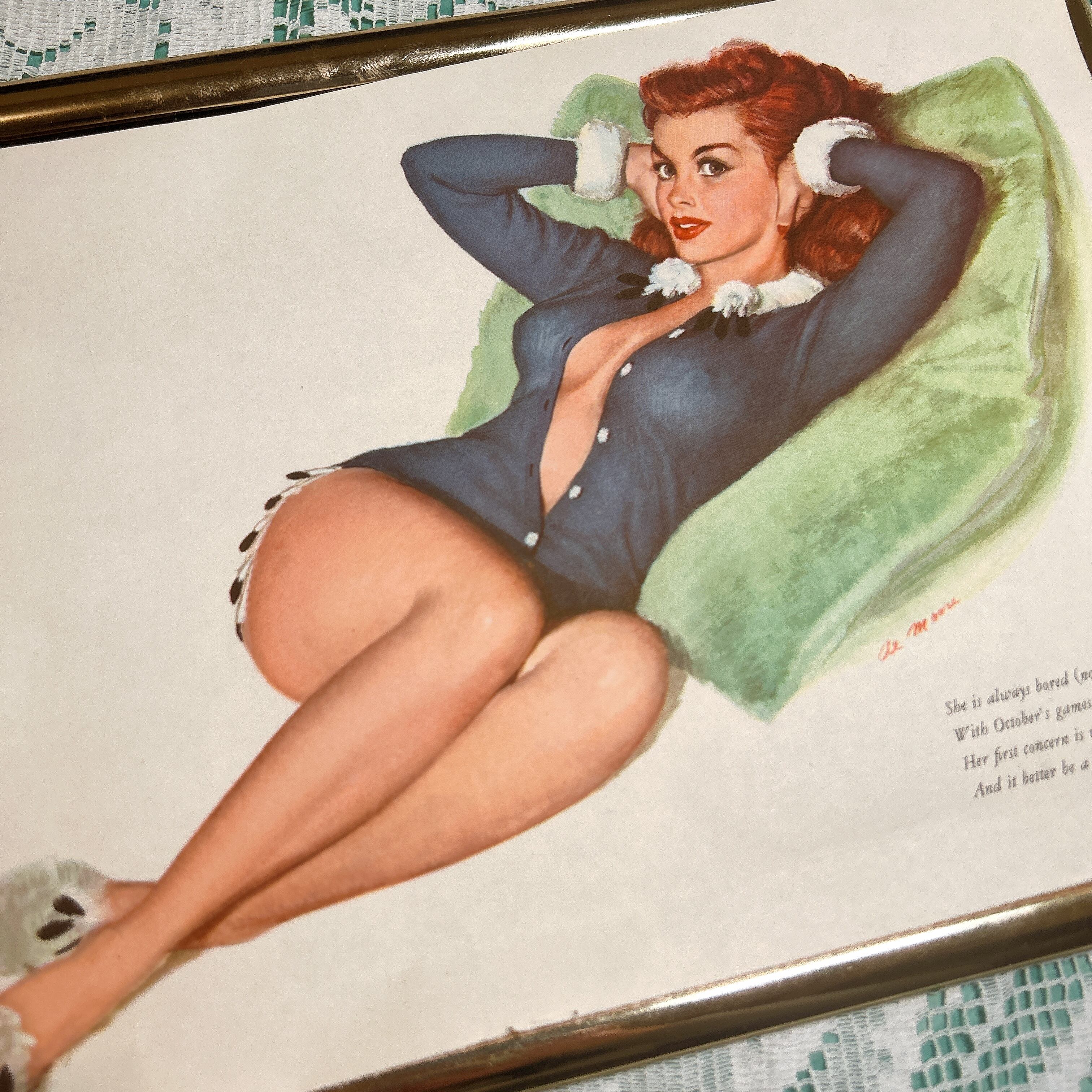 こちらは、アメリカのヴィンテージピンナップアートを使用したA4サイズのポスターです。魅惑的な女性のイラストと、ウィットに富んだ短い英語の詩が組み合わされたデザインが特徴です。1950年代のアメリカンピンナップアートの雰囲気を存分に楽しめる一枚となっています。