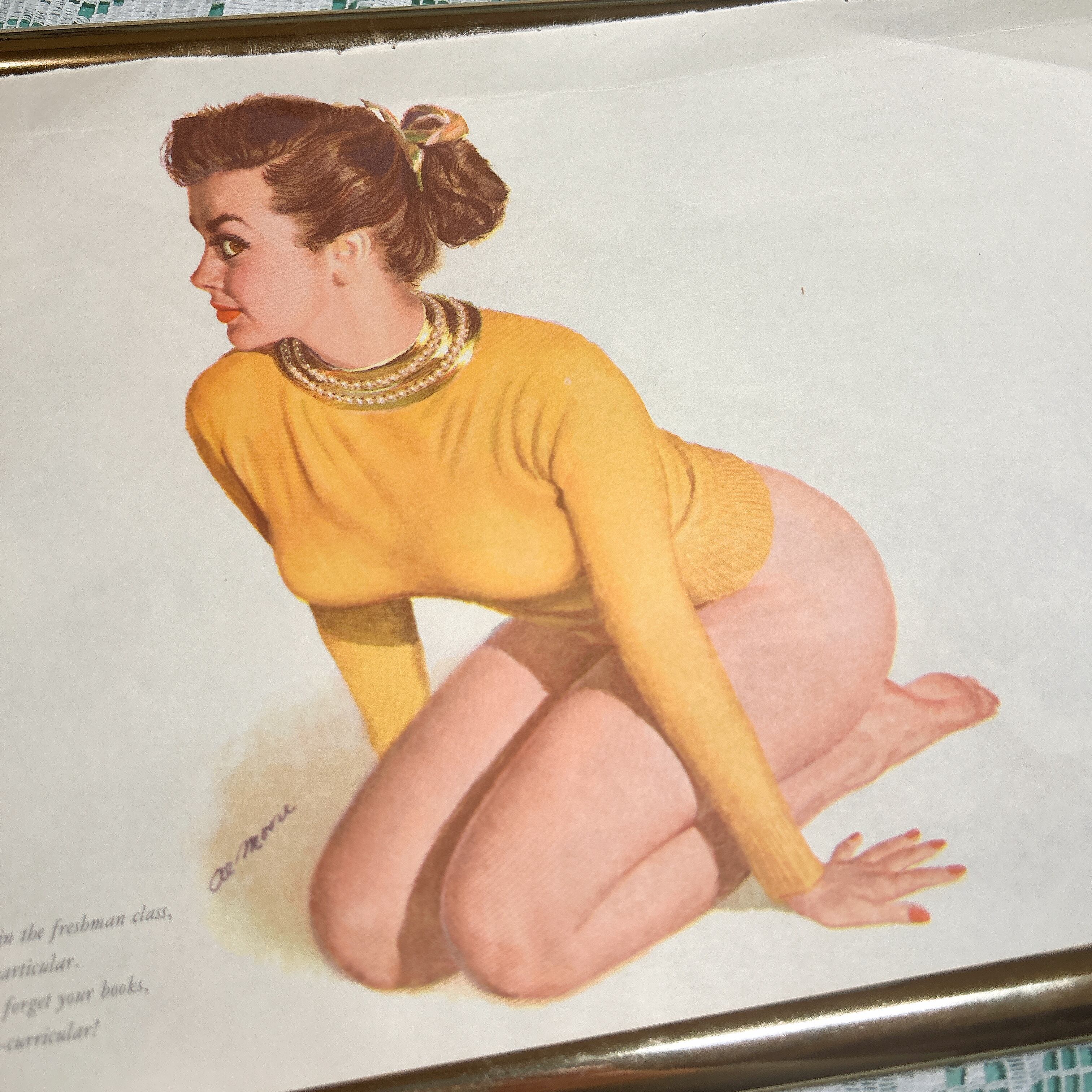 このポスターのメインビジュアルには、ゴールドのネックレスを身につけ、黄色のセーターを着た女性が描かれています。彼女は床に膝をついたポーズで、まるで何かに興味を引かれているかのように視線を向けています。シンプルながらも大胆な構図が、当時のピンナップアート特有の魅力を引き立てています。